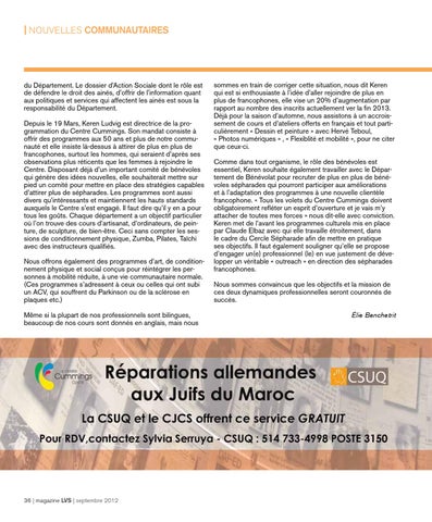 sommes en train de corriger cette situation, nous dit Keren qui est si enthousiaste à l’idée d’aller rejoindre de plus en plus de francophones, elle vise un 20% d’augmentation par rapport au nombre des inscrits actuellement ver la fin 2013. Déjà pour la saison d’automne, nous assistons à un accroissement de cours et d’ateliers offerts en français et tout particulièrement « Dessin et peinture » avec Hervé Teboul, « Photos numériques » , « Flexiblité et mobilité », pour ne citer que ceux-ci. Comme dans tout organisme, le rôle des bénévoles est essentiel, Keren souhaite également travailler avec le Département de Bénévolat pour recruter de plus en plus de bénévoles sépharades qui pourront participer aux améliorations et à l’adaptation des programmes à une nouvelle clientèle francophone. « Tous les volets du Centre Cummings doivent obligatoirement refléter un esprit d’ouverture et je vais m’y attacher de toutes mes forces » nous dit-elle avec conviction. Keren met de l’avant les programmes culturels mis en place par Claude Elbaz avec qui elle travaille étroitement, dans le cadre du Cercle Sépharade afin de mettre en pratique ses objectifs. Il faut également souligner qu’elle se propose d’engager un(e) professionnel (le) en vue justement de développer un véritable « outreach » en direction des sépharades francophones. Nous sommes convaincus que les objectifs et la mission de ces deux dynamiques professionnelles seront couronnés de succès. Élie Benchetrit