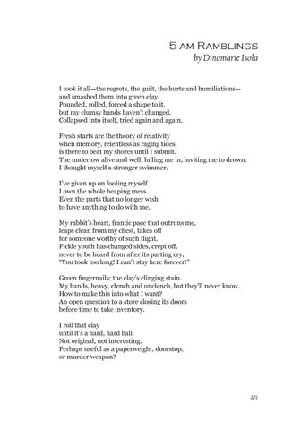 5 am Ramblings by Dinamarie Isola I took it all—the regrets, the guilt, the hurts and humiliations— and smashed them into green clay. Pounded, rolled, forced a shape to it, but my clumsy hands haven’t changed. Collapsed into itself, tried again and again. Fresh starts are the theory of relativity when memory, relentless as raging tides, is there to beat my shores until I submit. The undertow alive and well; lulling me in, inviting me to drown. I thought myself a stronger swimmer. I’ve given up on fooling myself. I own the whole heaping mess. Even the parts that no longer wish to have anything to do with me. My rabbit’s heart, frantic pace that outruns me, leaps clean from my chest, takes off for someone worthy of such flight. Fickle youth has changed sides, crept off, never to be heard from after its parting cry, “You took too long! I can’t stay here forever!” Green fingernails; the clay’s clinging stain. My hands, heavy, clench and unclench, but they’ll never know. How to make this into what I want? An open question to a store closing its doors before time to take inventory. I roll that clay until it’s a hard, hard ball. Not original, not interesting. Perhaps useful as a paperweight, doorstop, or murder weapon?