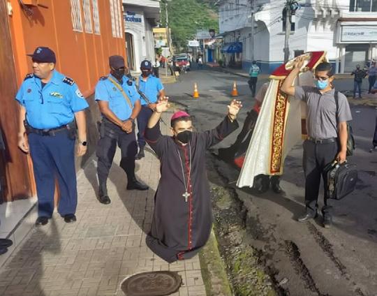 Bishop Álvarez Lagos surrounded by security forces, 2022. Photo: Diocese of Matagalpa Cardinal Leopoldo Brenes and Bishop Álvarez (photo prior to arrest)