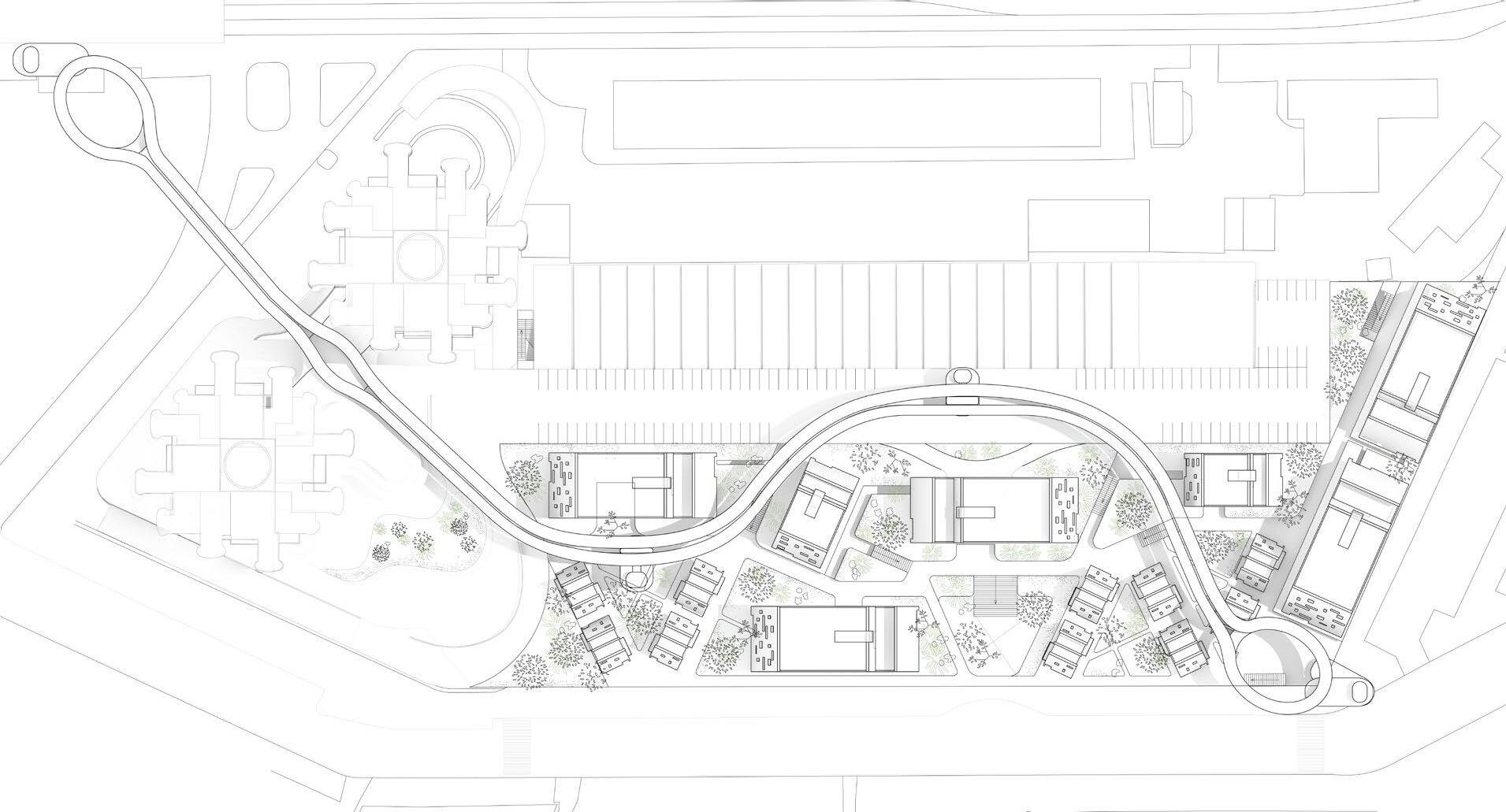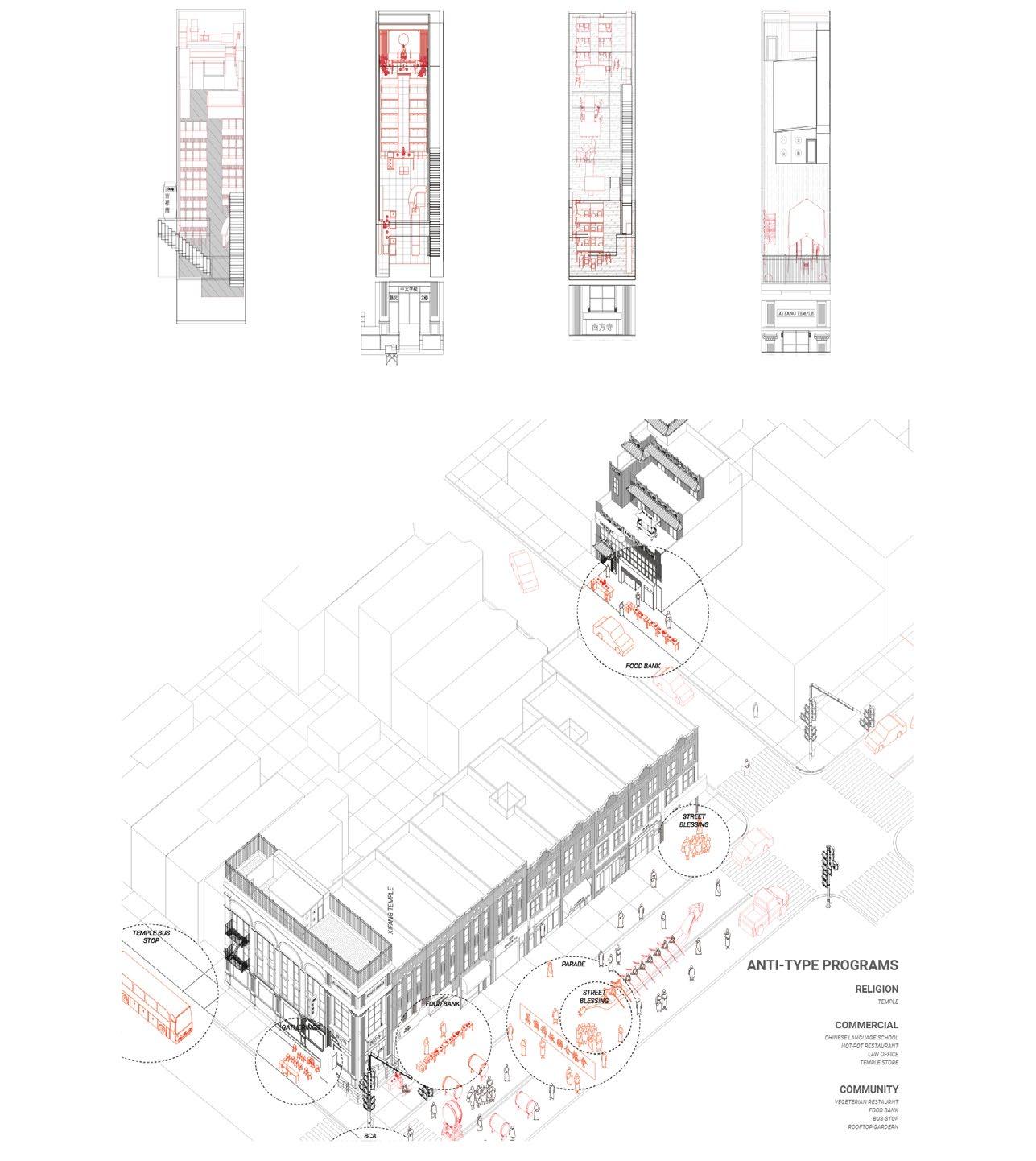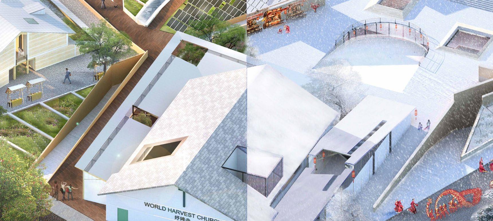 The inactive church remains a focal structure, with temple programs surrounding and integrating into its interior. Residential blocks are designed as two-level units: ground floors cater to families, while second floors accommodate couples. The education and composting centers are located underground to optimize space usage and minimize visual disruption.