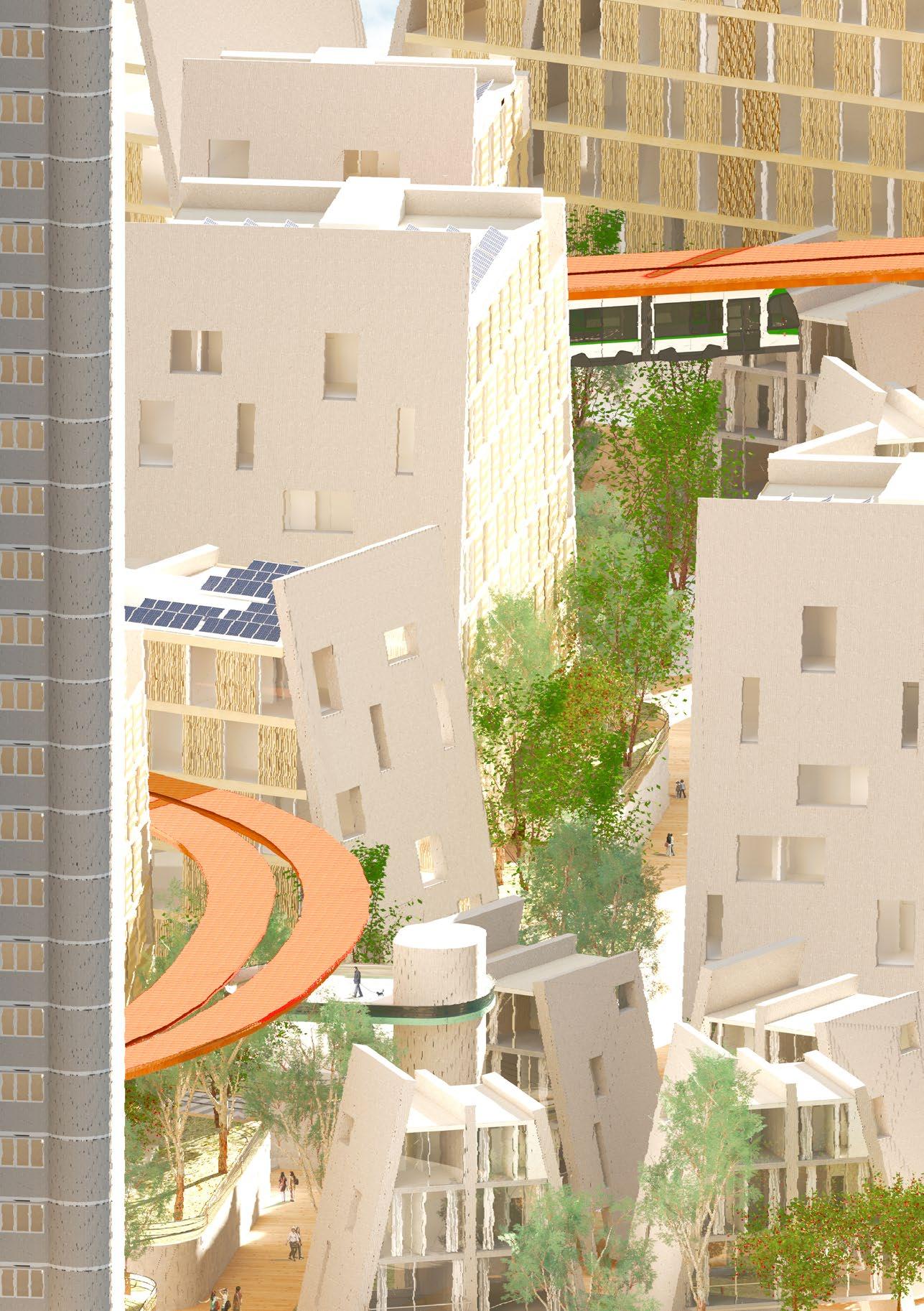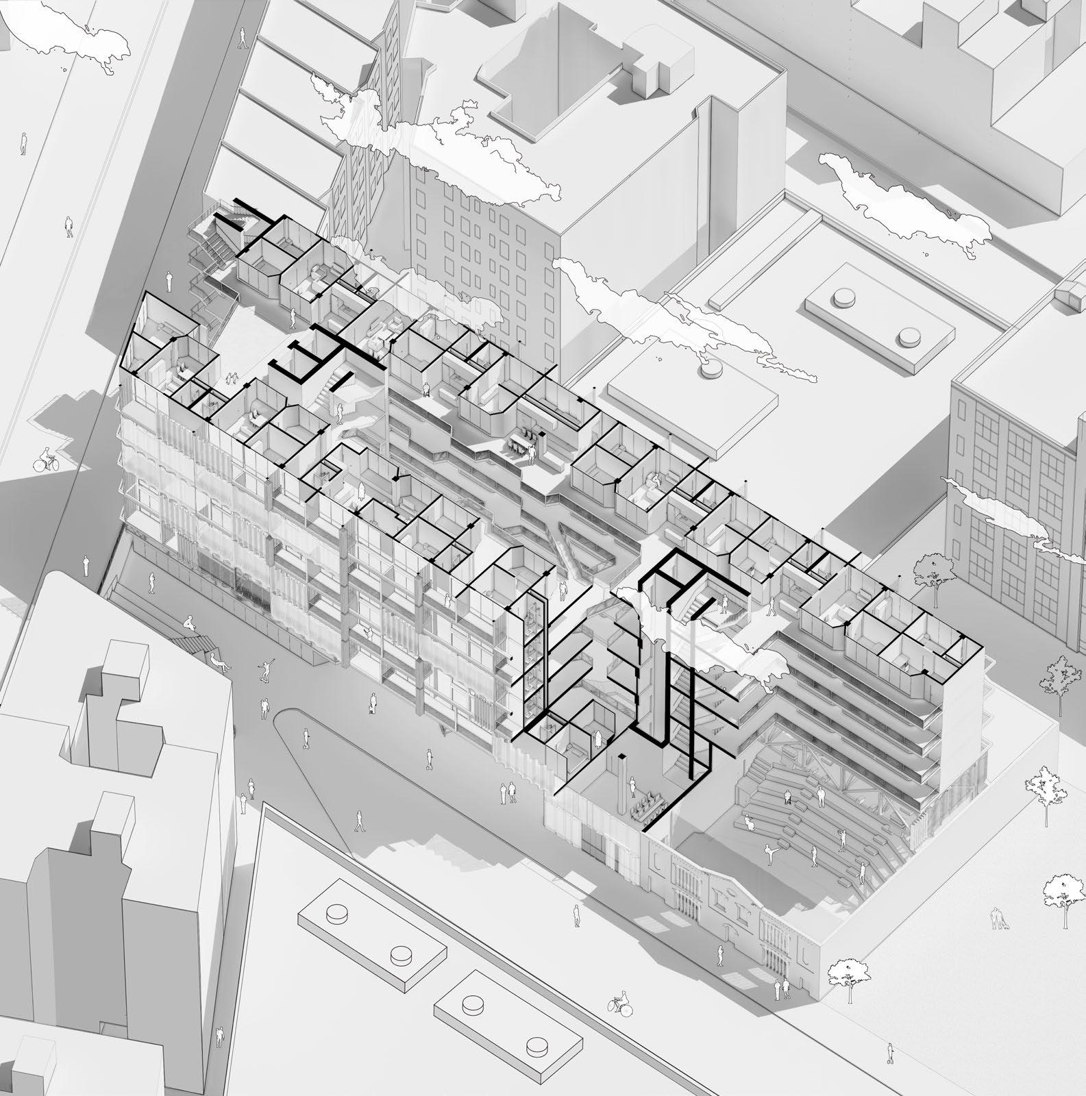 Transform the original tracy towers 6th floor’s part of the residential to public space. Integrate with the tram station and become public programs including library, learning spaces and rooftop gardens. supported by a clear vertical circulation system.