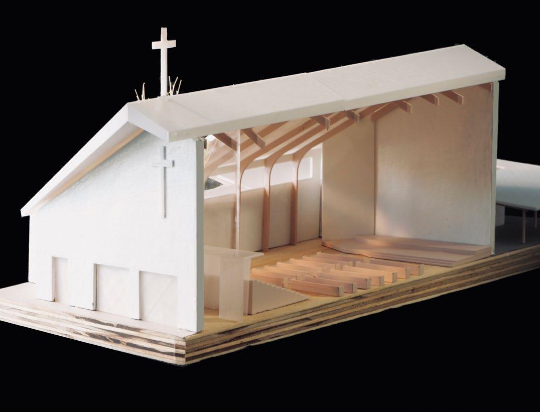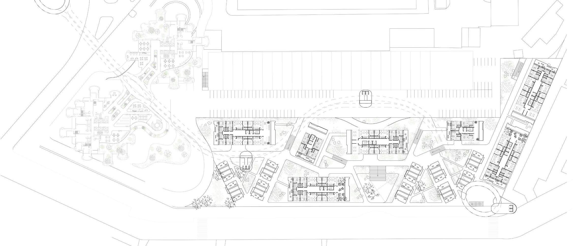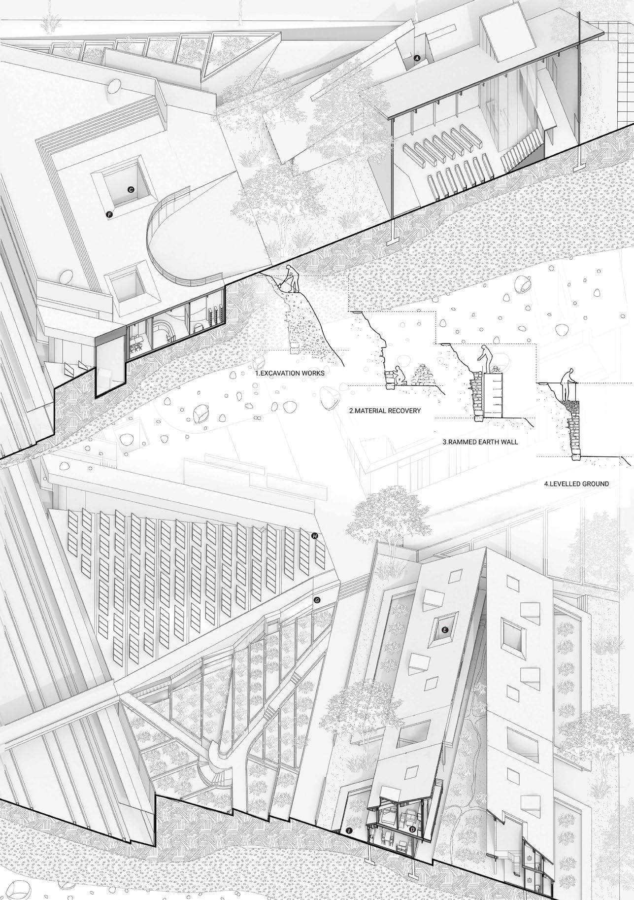 The inactive church remains a focal structure, with temple programs surrounding and integrating into its interior. Residential blocks are designed as two-level units: ground floors cater to families, while second floors accommodate couples. The education and composting centers are located underground to optimize space usage and minimize visual disruption.