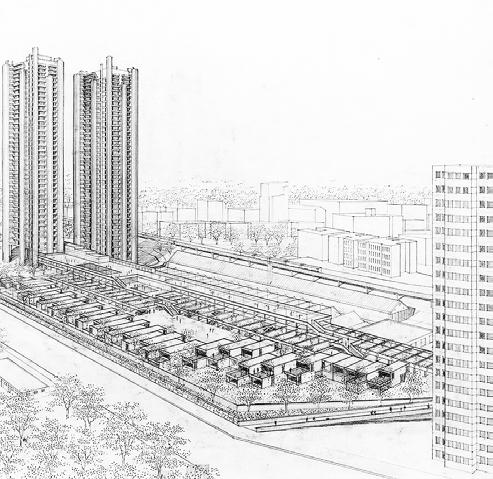 But this important part of the design was never built. As a result, the plinth became an empty, unused space, and the towers feel disconnected from the neighborhood.