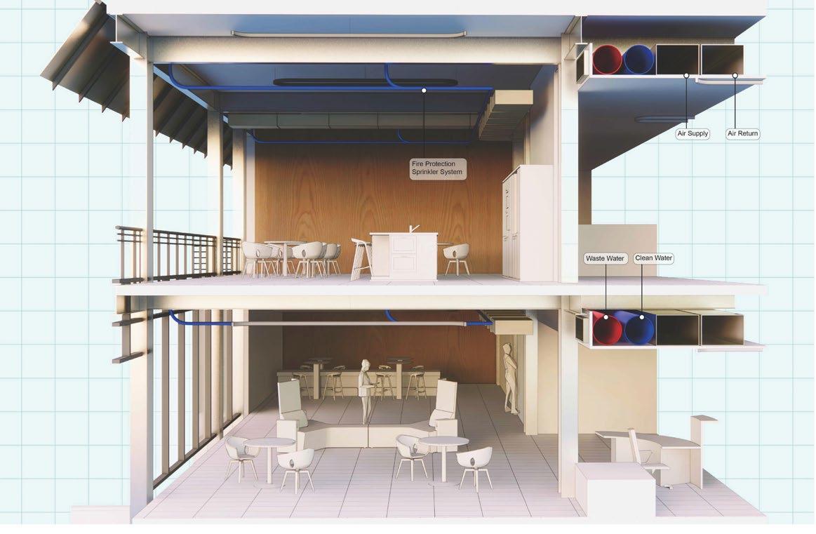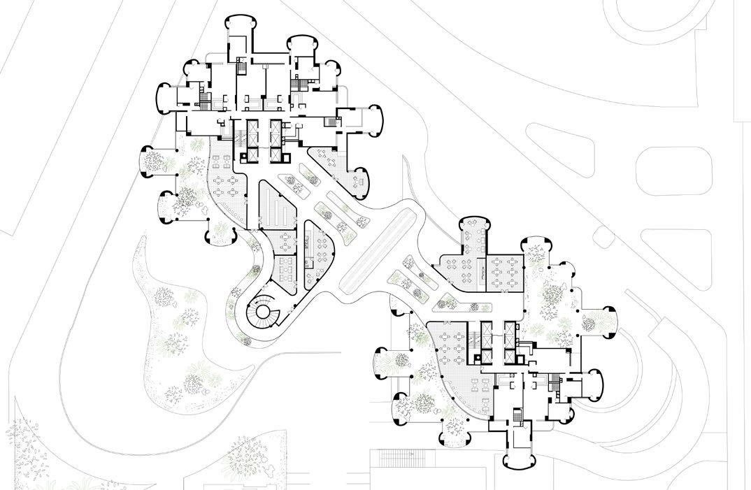 Ground floors are semi-public space. A split slab system to separate community amenities from residential floors — including daycare centers, co-working spaces and rooftop gardens.