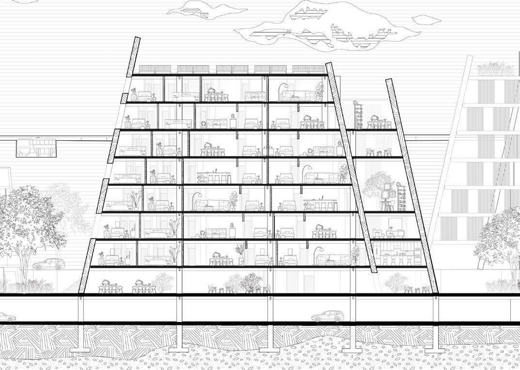 Transform the original tracy towers 6th floor’s part of the residential to public space. Integrate with the tram station and become public programs including library, learning spaces and rooftop gardens. supported by a clear vertical circulation system.