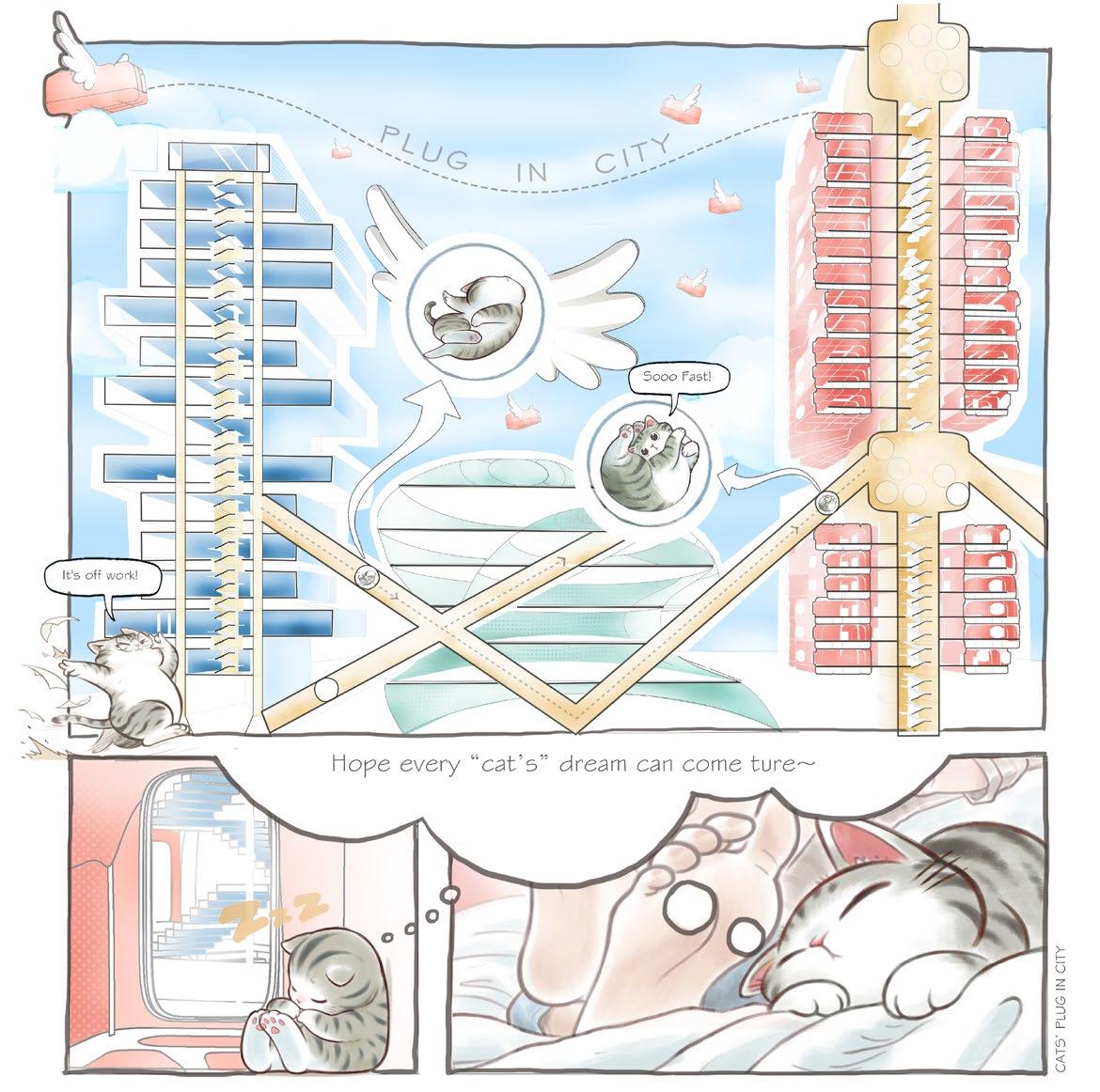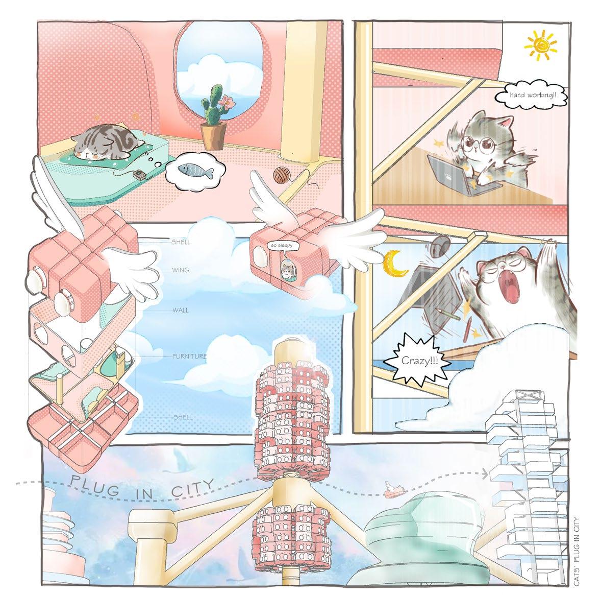 The cat wakes up in its own plug-in dwelling unit, and the movable device has spread its wings to fly to the plug-in office. At the office the cat struggles to draw from day to night, and after work it can quickly reach the entertainment places through the transportation pipeline to play with its’ friends, and finally it returns home exhausted and falls asleep. The last picture of the cat sleeping peacefully at the owner's feet, found that this day's life is just a dream of the cat.