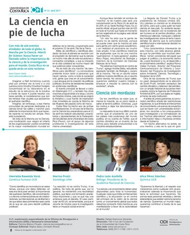 defensa de la ciencia, programada para el próximo 22 de abril, Día de la Tierra. Miles de científicos y científicas alrededor de todo el planeta se reunirán con el propósito de demostrar que la ciencia va mucho más allá de solo ecuaciones y conceptos complejos, y que su impacto en la vida cotidiana es mucho mayor del que solemos estar conscientes. No se trata de una marcha “de científicos para científicos”. La convocatoria pretende incluir tanto a personas que hacen ciencia, como a toda la sociedad civil, gente que crea en el conocimiento y que abogue por la creación de políticas públicas y la toma de decisiones basadas en evidencias científicas. El evento principal se llevará a cabo en Washington D.C. y también hay otras marchas programadas a lo largo y ancho de Estados Unidos, país donde se originó la iniciativa y cuya fuente de inspiración más inmediata es quizás la Marcha de las Mujeres del pasado ocho de marzo. Costa Rica ha hecho eco de ambas manifestaciones. En el caso de la Marcha por la Ciencia los preparativos para el 22 de abril los realizan estudiantes universitarios y representantes de la Federación de Estudiantes de la Universidad de Costa Rica (Feucr), con el apoyo de algunos profesores e investigadores de esta misma universidad.