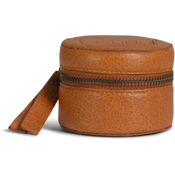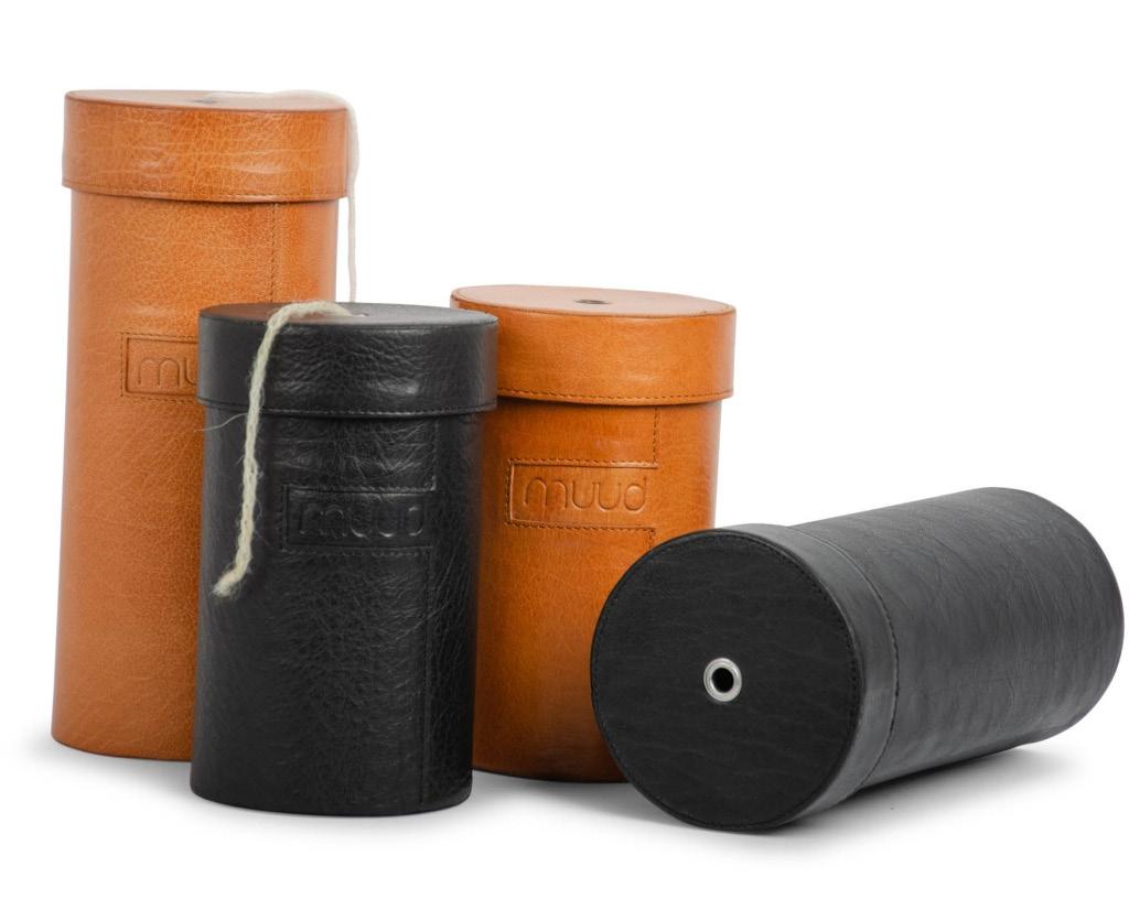 Almacenamiento cilíndrico de cuero para accesorios y agujas pequeñas.
