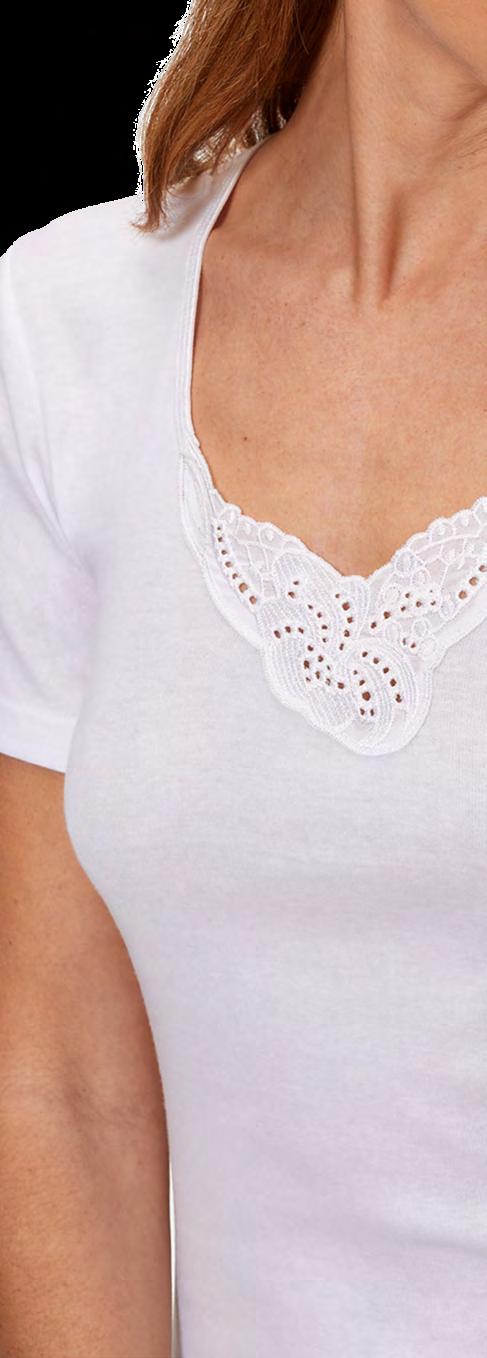 Camiseta de manga corta realizada en 100% algodón, con detalle de encaje elástico en el escote, sin costuras laterales.