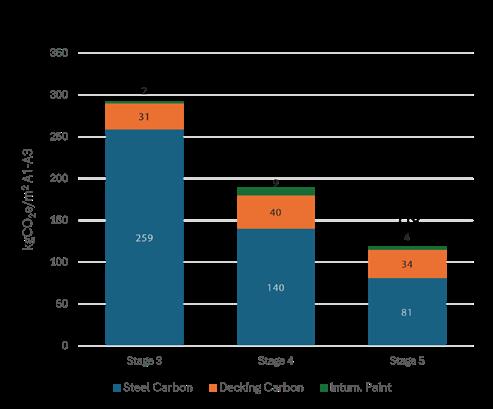 60% of the total material procured on this project was lowembodied carbon steel, produced using 100% renewable energy and 100% scrap, leading to 333 kgCO2e/t (production stage).