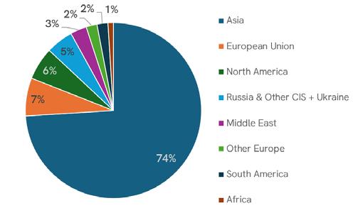 The production of crude steel in 2024 was about 1,885,000 t, with the following geographical distribution (see Figure 2). The production of steel in Asia (China, India, Japan, South Korea, and Taiwan) is about 74% of global production.