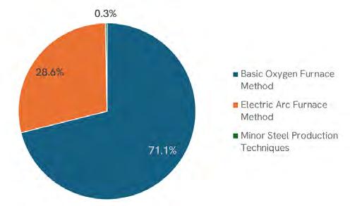 Globally, in 2023, the distribution of steel production by process is about 71% for BF–BOF and 29% for the EAF (see Figure 3).