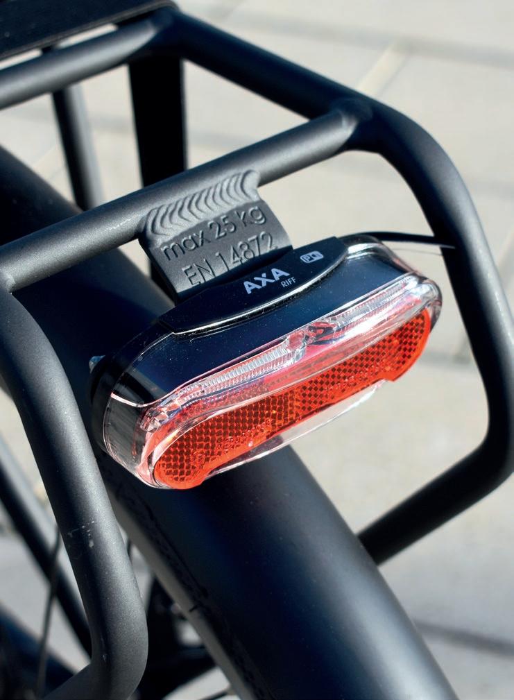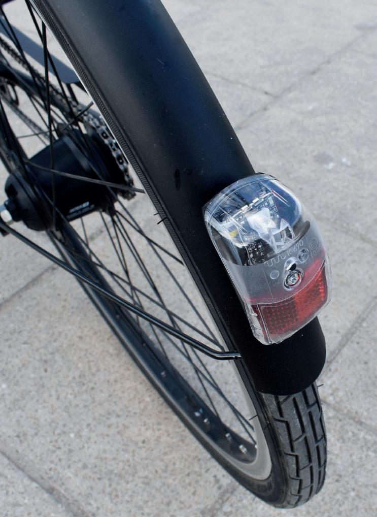 internally routed, as is the dynamo wiring within the front fork and main frame. The head tube is specially shaped to accommodate a frame-integrated front LED. It looks stylish and gives the lamp some protection too. The front LED can be relocated to sit on the front of an optional, metal basket-style front rack (load rating 5kg, £54.95), which uses the light housing on the frame for mounting. A front basket is a practical choice for a city bike, as you can just drop your shoulder bag in it and pedal off.