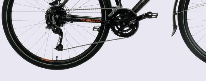 bottom bracket, Shimano HG chain, Shimano CS-HG400 11-36 cassette. Shimano Alivio shifters and front and rear derailleurs. 27 ratios: 19-112in.