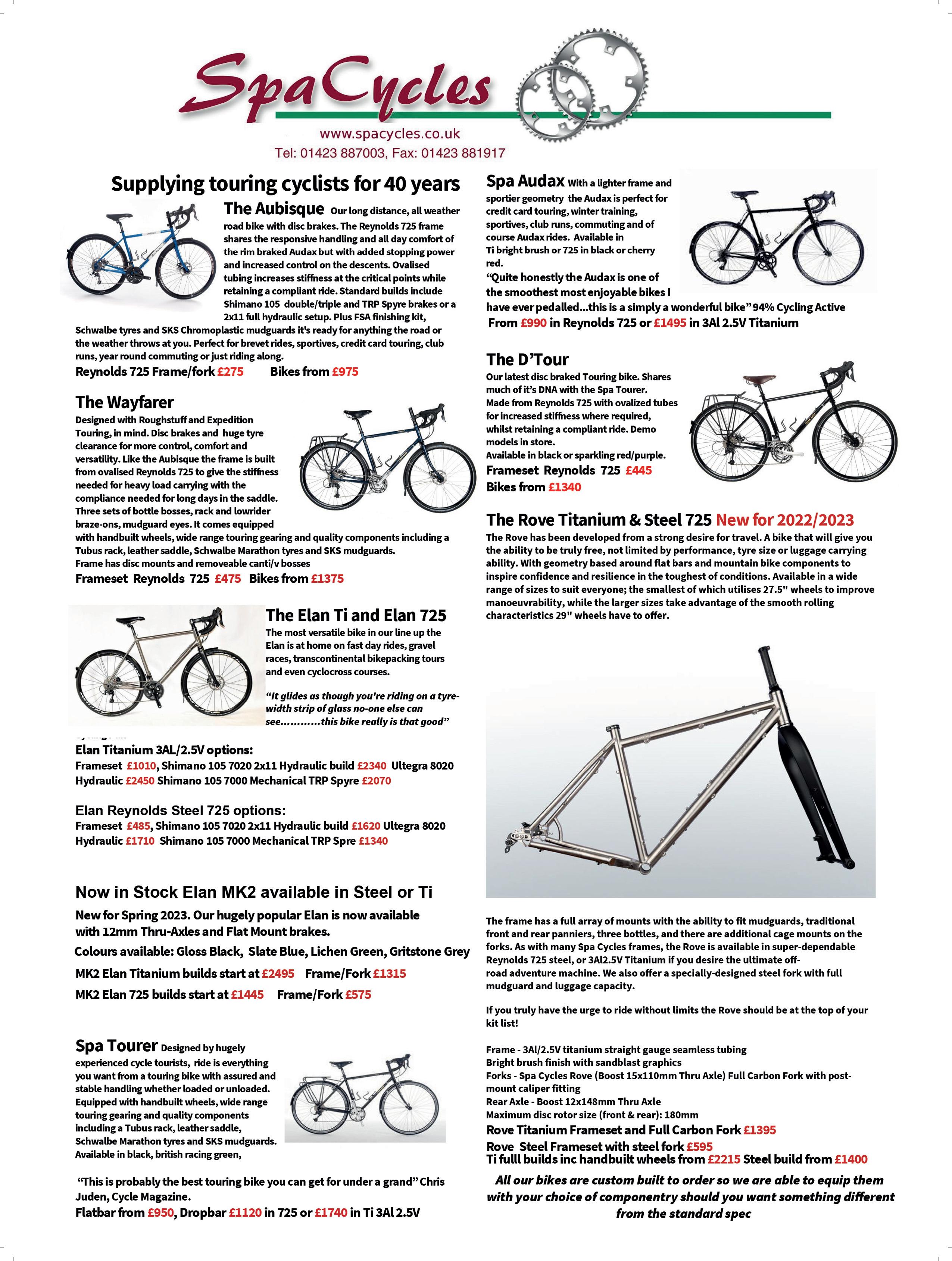 Reynolds 725 frame with Deore V-brakes, BBB trekking bar, quality handbuilt wheels (26in for the smallest size) and your choice of tyres and gear ratios. spacycles.co.uk