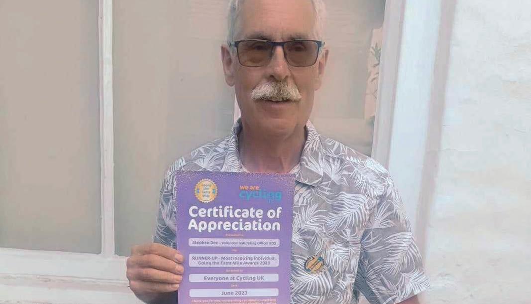 Stephen Dee is the Cycling UK volunteer validating officer for the British Cycle Quest (BCQ), a national challenge taking in 402 checkpoints throughout England, Wales and Scotland, including many of the islands. He was a runner-up in our recent Going the Extra Mile awards as the Most Inspiring Individual for his meticulous attention to detail, and the enthusiasm and efficiency with which he carries out the role. He has just completed the entire BCQ challenge himself and was presented with a platinum medal in recognition of his achievement.