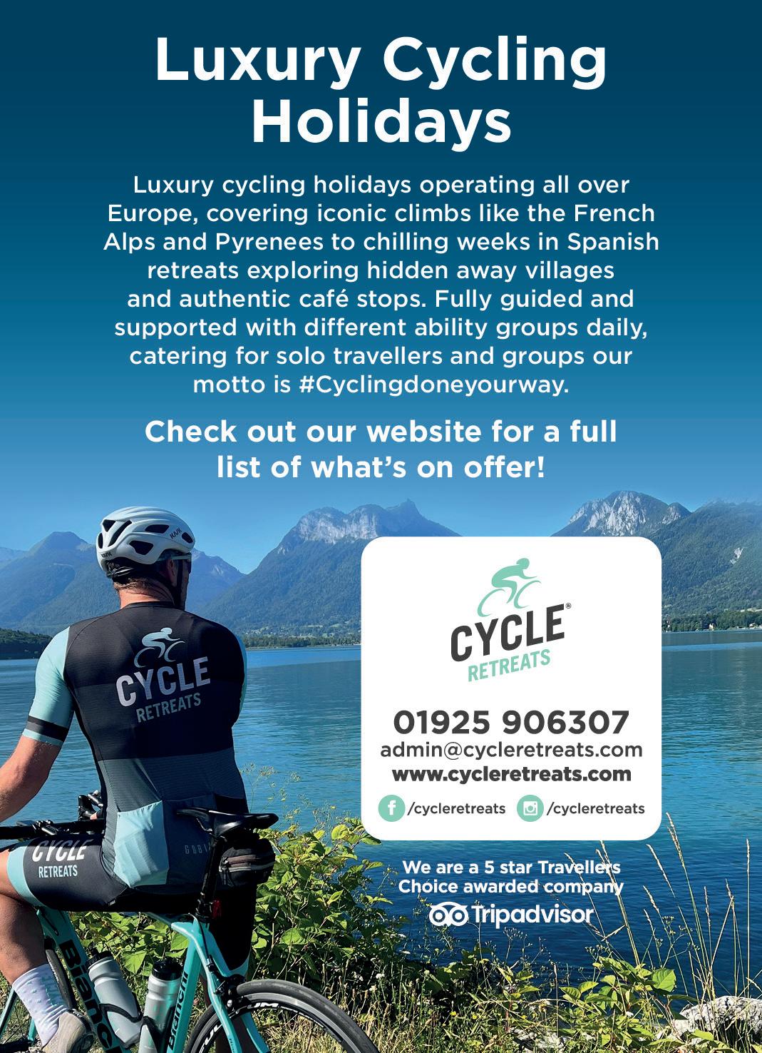 CYCLING UK: Parklands, Railton Road, Guildford, GU2 9JX E: cycling@cyclinguk.org W: cyclinguk.org T: 01483 238300. Cycle promotes the work of Cycling UK. Cycle’s circulation is approx. 51,000. Cycling UK is one of the UK’s largest cycling membership organisations, with approx. 70,500 members and affiliates. President: Jon Snow Chief executive: Sarah Mitchell. Cyclists’ Touring Club, a Company Limited by Guarantee, registered in England No 25185, registered as a charity in England and Wales Charity No 1147607 and in Scotland No SC042541. Registered office: Parklands, Railton Road, Guildford, GU2 9JX. CYCLE MAGAZINE: Editor: Dan Joyce E: editor@cyclinguk.org Designer: Christina Richmond Advertising: Jacob Tregear T: 0203 859 7100 E: jacob.tregear@jamespembrokemedia.co.uk Publisher: James Houston. Cycle is published six times per year on behalf of Cycling UK by James Pembroke Media, 90 Walcot Street, Bath, BA1 5BG. T: 01225 337777. Cycle is copyright Cycling UK, James Pembroke Media, and individual contributors. Reproduction in whole or in part without permission from Cycling UK and James Pembroke Media is forbidden. Views expressed in the magazine are those of the individual contributors and do not necessarily reflect those of the editor or the policies of Cycling UK. Advertising bookings are subject to availability, the terms and conditions of James Pembroke Media, and final approval by Cycling UK. Printed by: Acorn Web Offset Ltd, Loscoe Close, Normanton Industrial Estate, Normanton, WF6 1TW T: 01924 220633