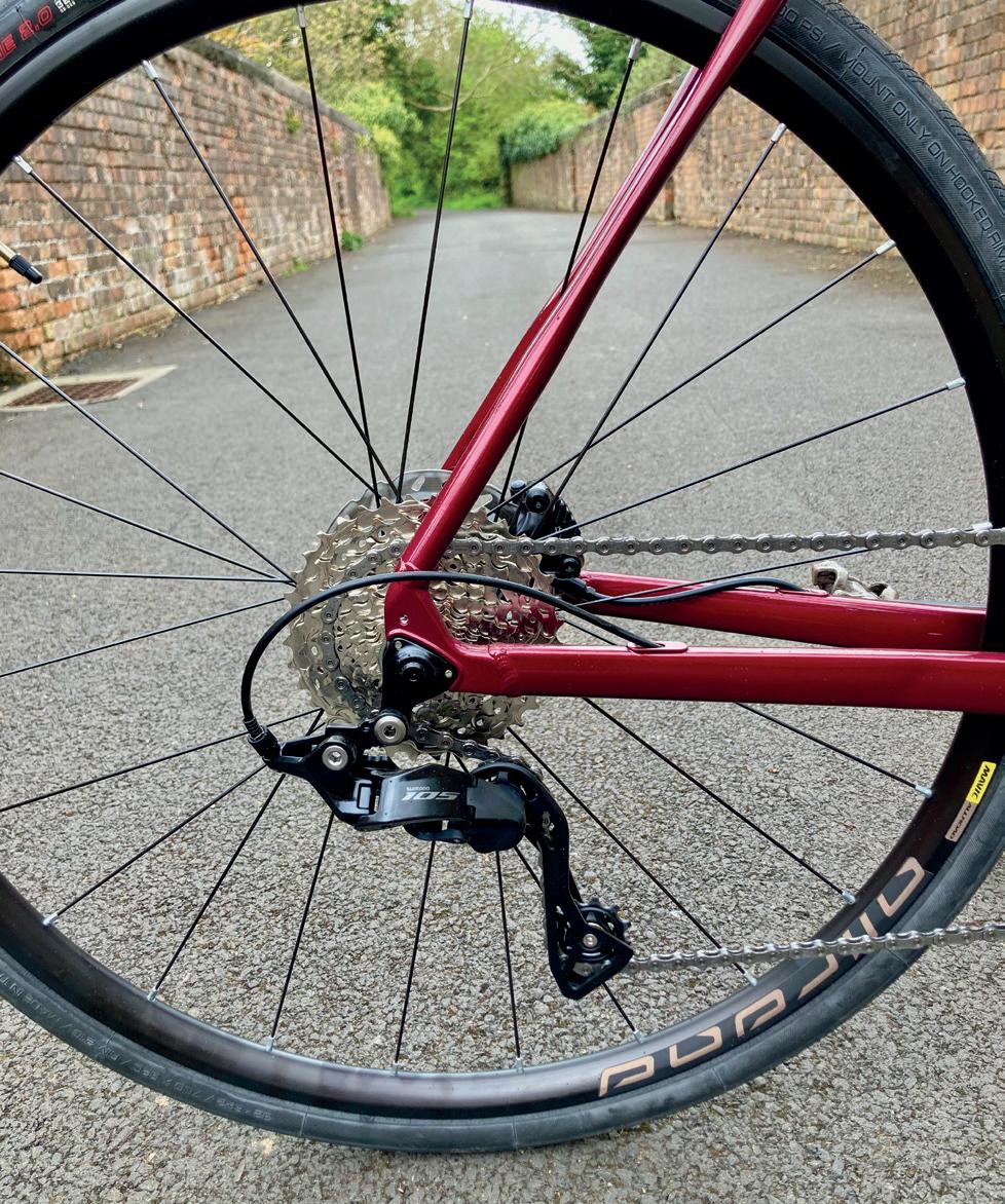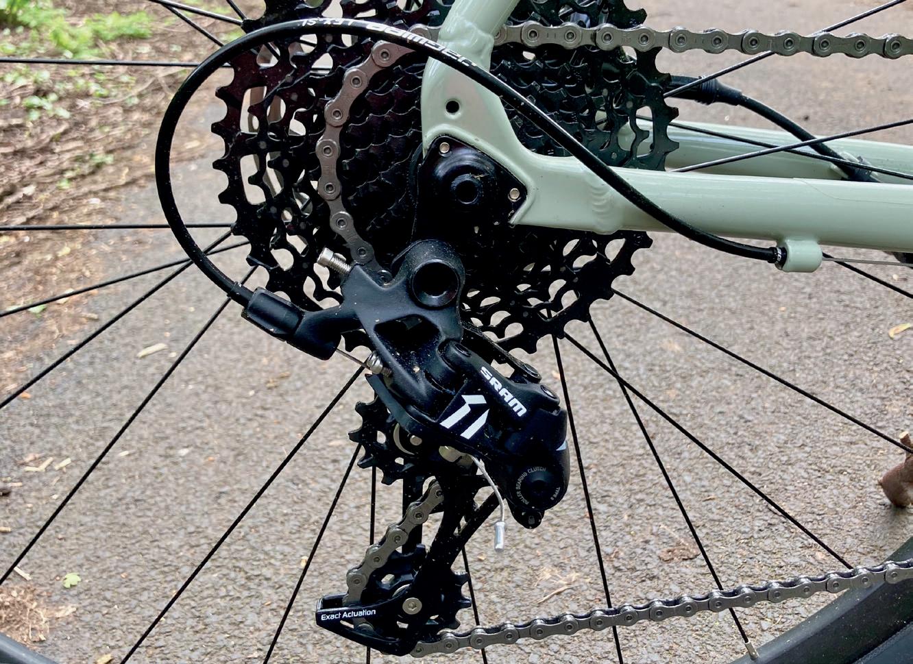 precise indexing throughout the range. The drivetrain shifts smoothly and that bottom gear bails you out on steeper climbs.