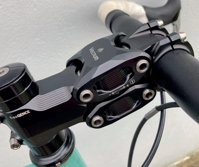 THE HEAVYWEIGHT CONTENDER in this review, the Moloko bar (anyone else thinking of A Clockwork Orange?) is 722g on my scales. That’s down to it being made of steel; the others are aluminium. Steel helps eliminate some off-road buzz, meaning less stress on your paws over long rides. At 735mm wide and with a more modest sweep of 35° (10° less than the Jones), it’s another comfortable bar that gives plenty of options for hand placement. There’s guidance on where to trim the bar if you find it too wide. The wee ‘horns’ are a nice touch if you’re trying to be aero – or need something to hold fast to when hauling yourself uphill.