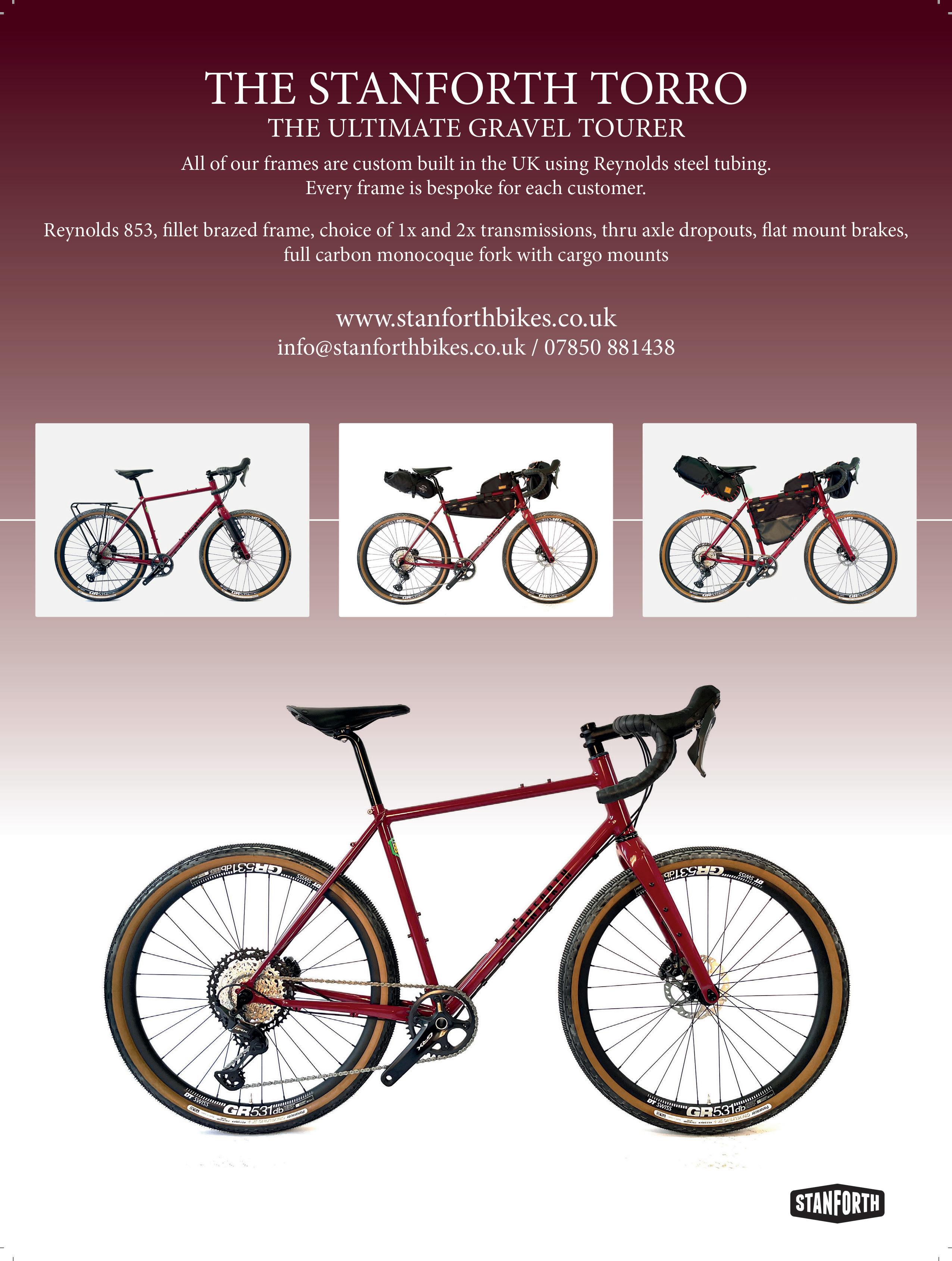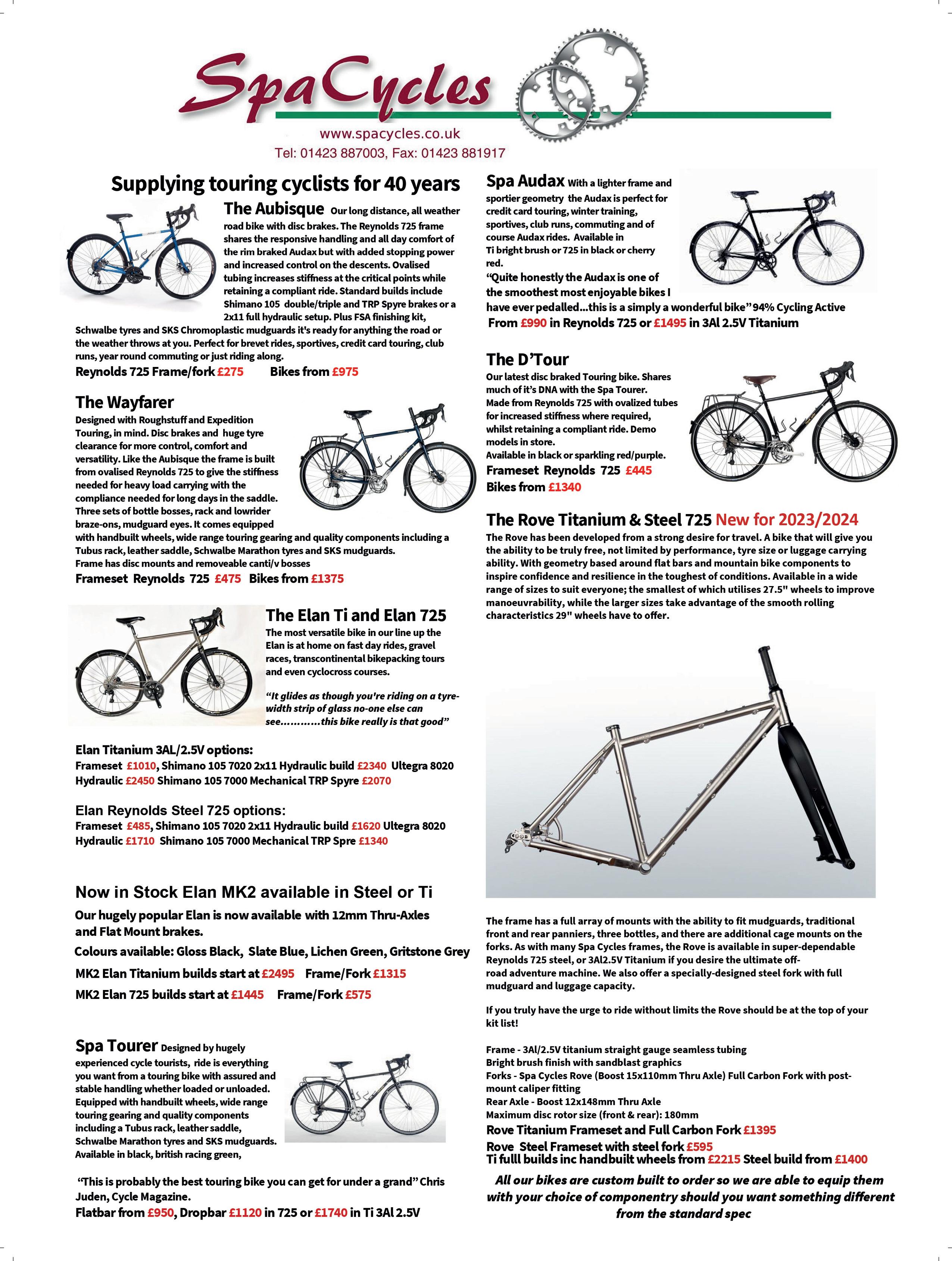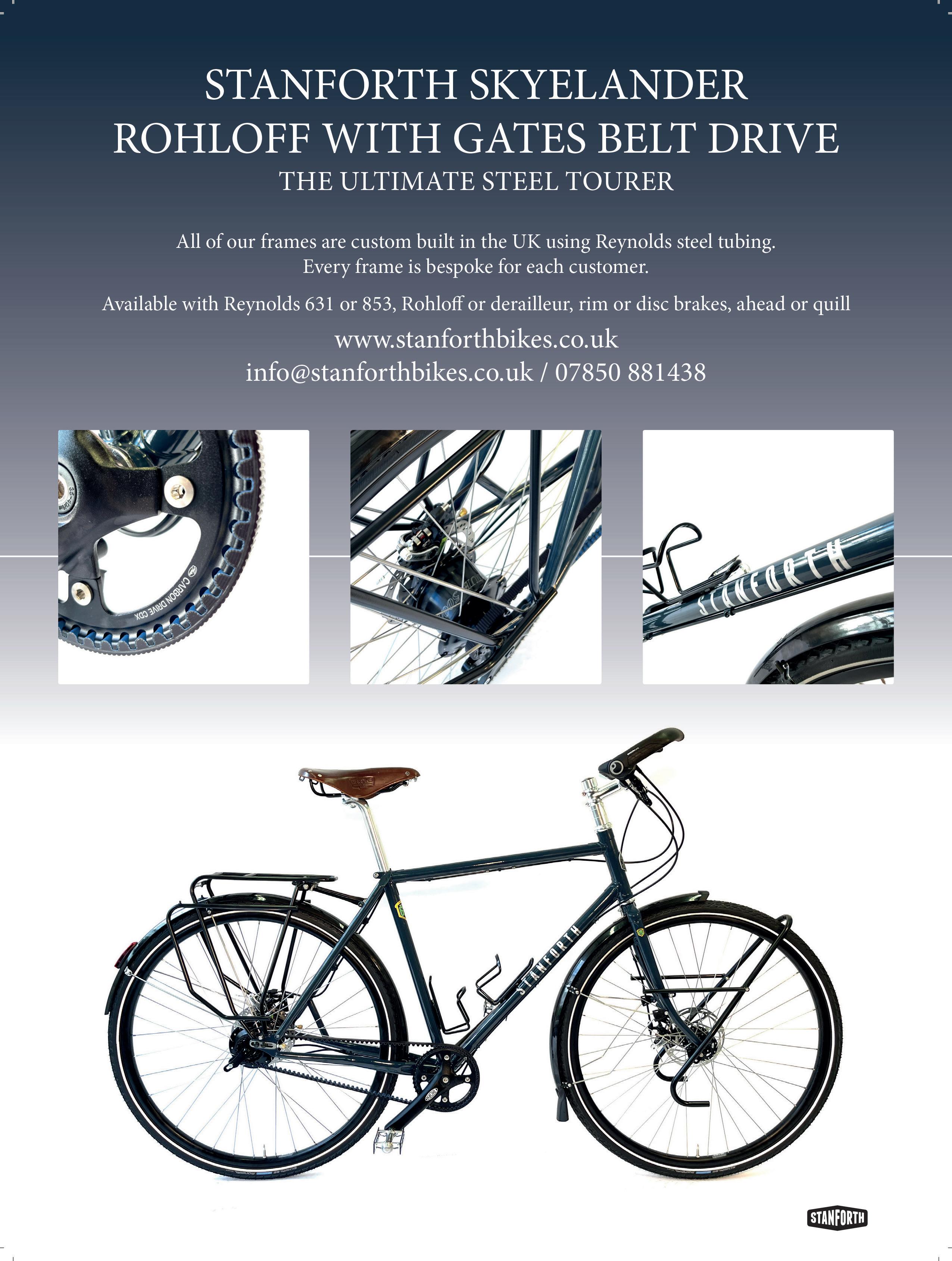Reynolds-725-framed, triplechainset-equipped tourer with handbuilt wheels, Brooks saddle, mudguards and Tubus rear rack. spacycles.co.uk