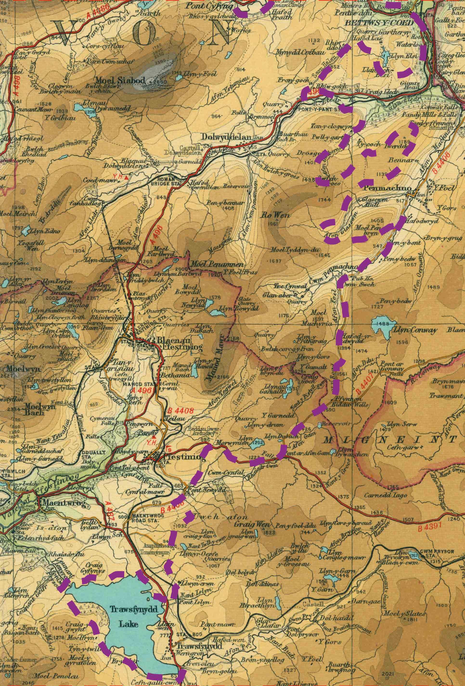 3 nights – 50km per day Distance (km) Ascent (m) Machynlleth to Dolgellau 61 1199 Dolgellau to Trawsfynydd (after lake loop) 41 915 Trawsfynydd to Betws-y-Coed 51 1279 Betws-y-Coed to Conwy 54 1264 2 nights – 70km per day Distance (km) Ascent (m) Machynlleth to Dolgellau 61 1199 Dolgellau to Betws-y-Coed 92 2194 Betws-y-Coed to Conwy 54 1264