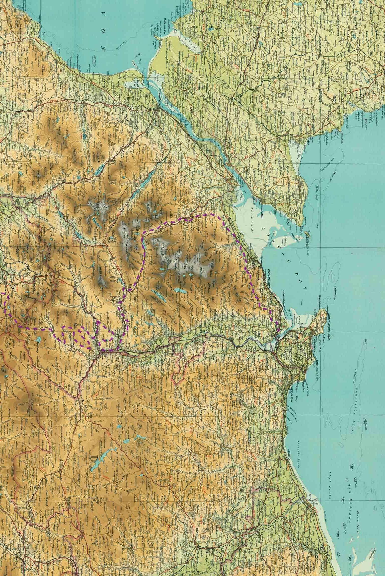 views over the Menai Straits and the island of Ynys Môn (Anglesey) to your left. Dropping almost to the coast you then climb back into the mountains and prehistory on rocky tracks that still echo with Roman sandal steps. Wild ponies, sheep and soaring raptors are likely to be your only company past ancient burial mounds, stone circles and hill forts before the final descent to the wide waters and narrow streets of richly storied Conwy.