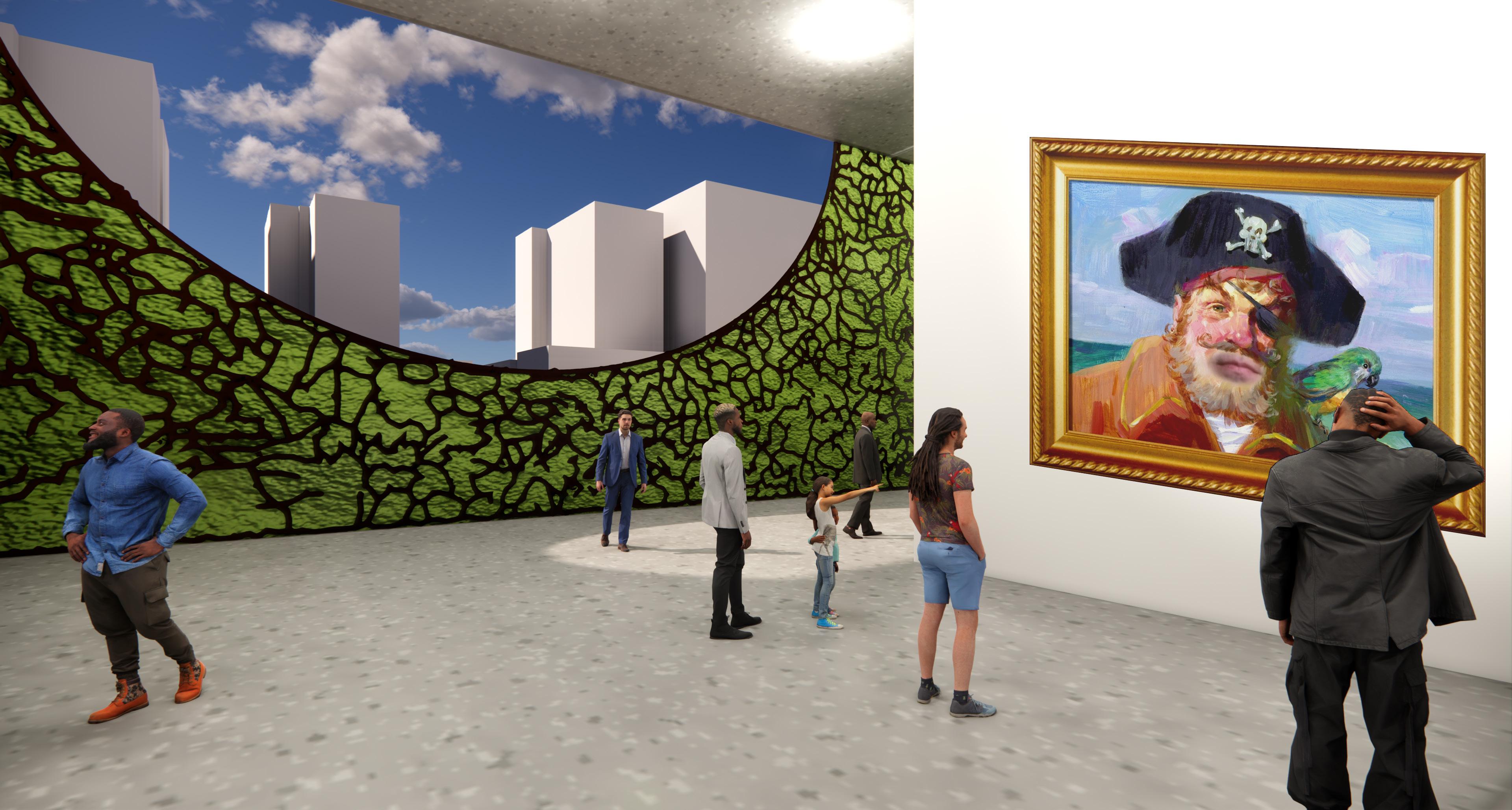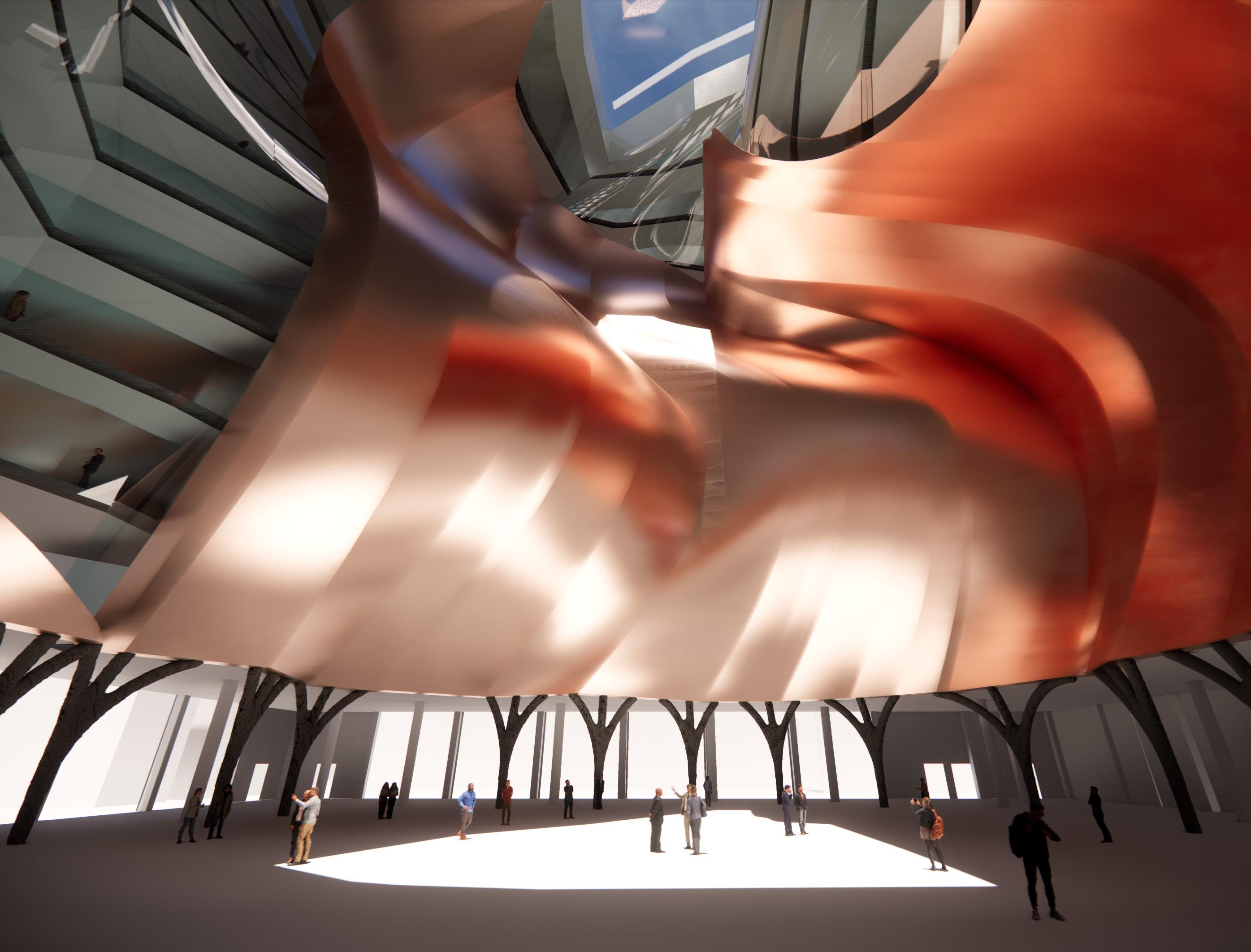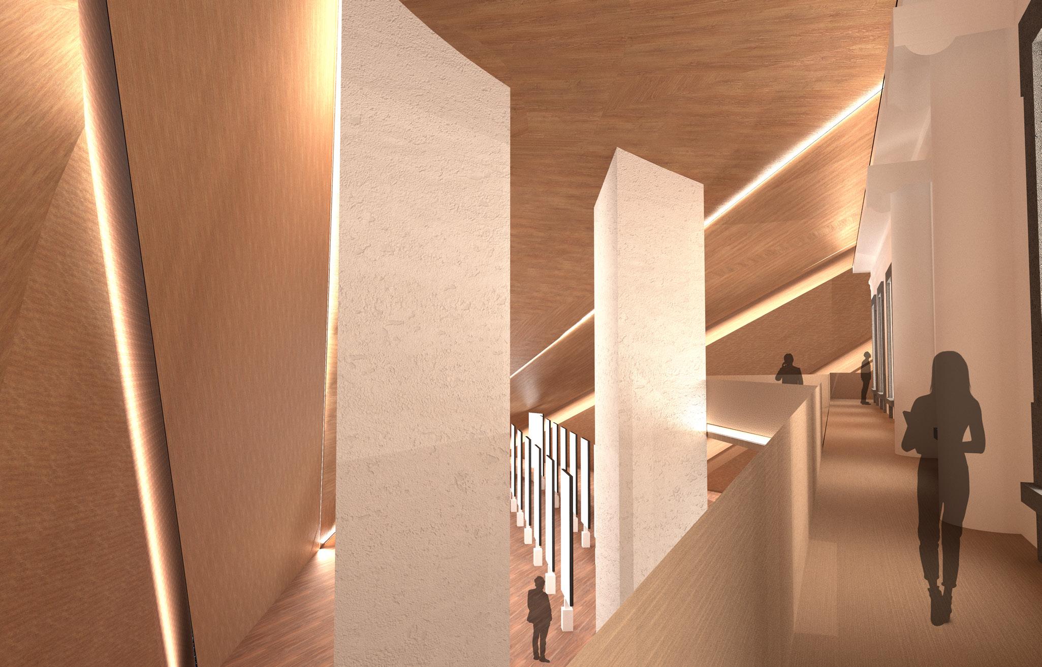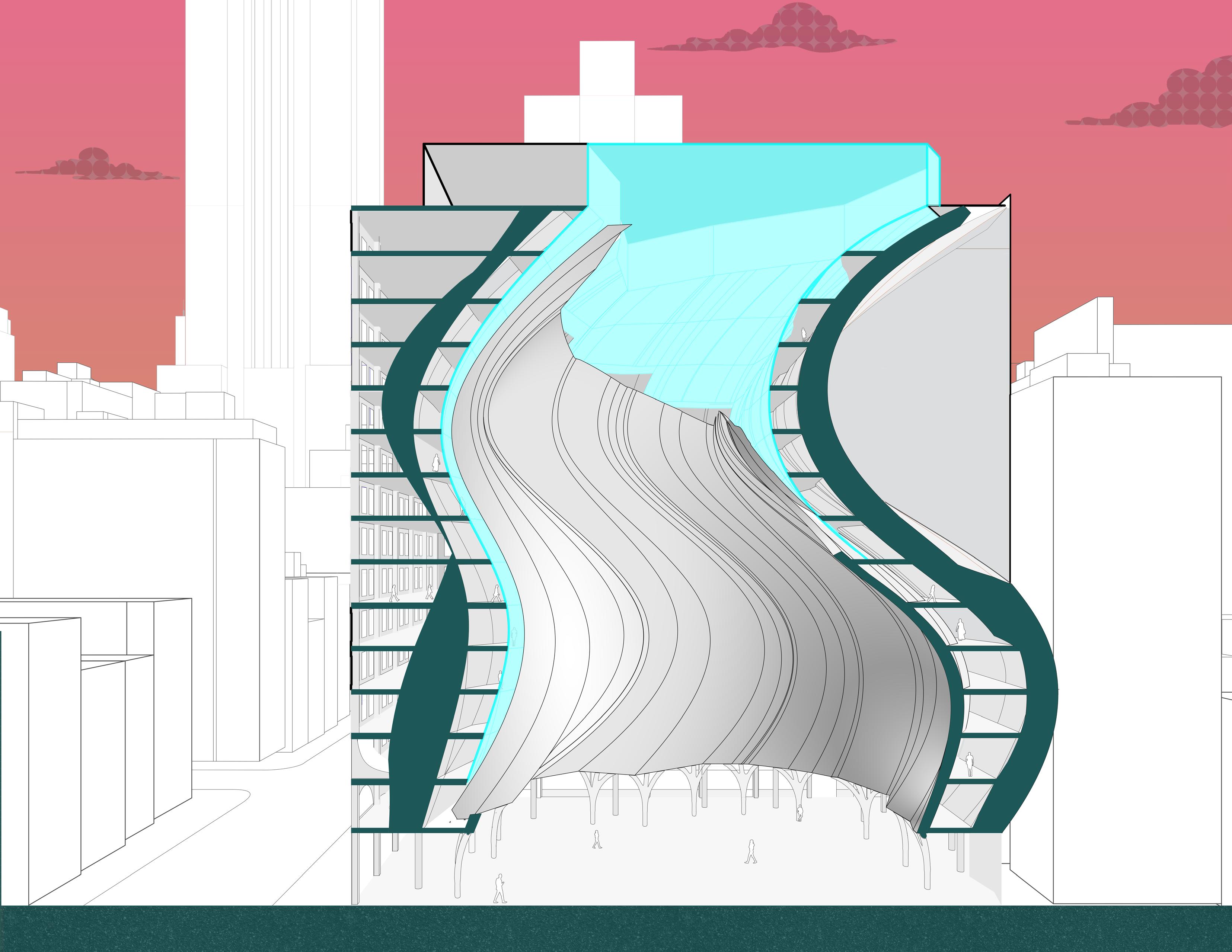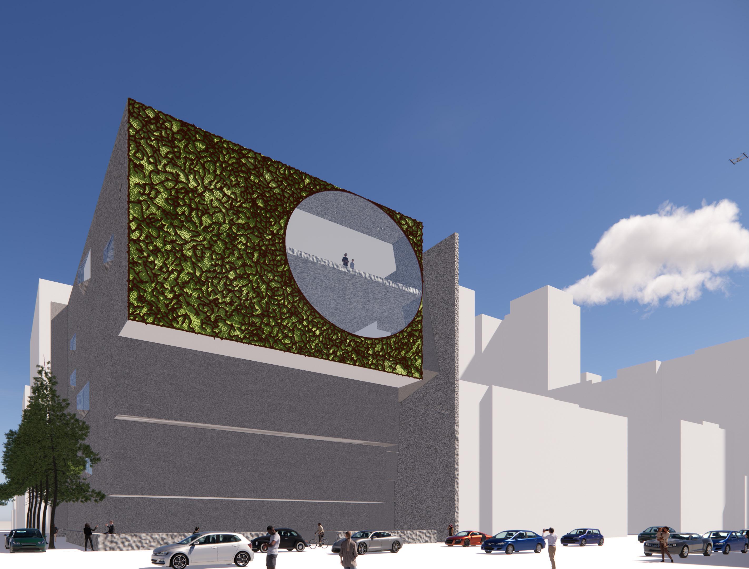 This intervention into the Met Breuer introduces a living wall on the fourth floor gallery level of the building. The prompt for this intervention asks to bring more light into the building while limiting the amount of materials discarded. Thus, the living wall is given a circular cutout to serve as a window that lets in the maximum amount of sunlight into the gallery. Tree branches carved from mahogany are added to bring the wall to life.
