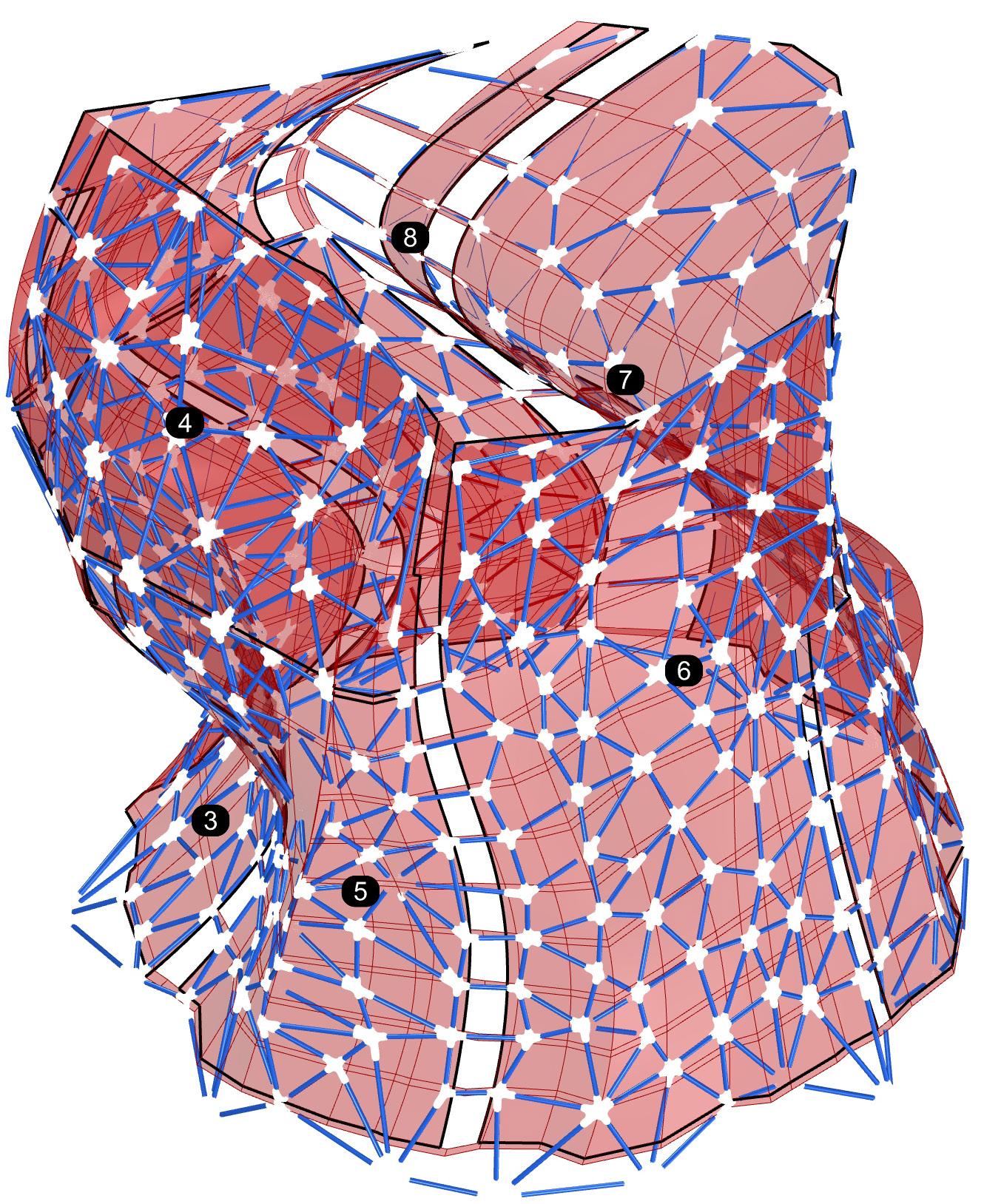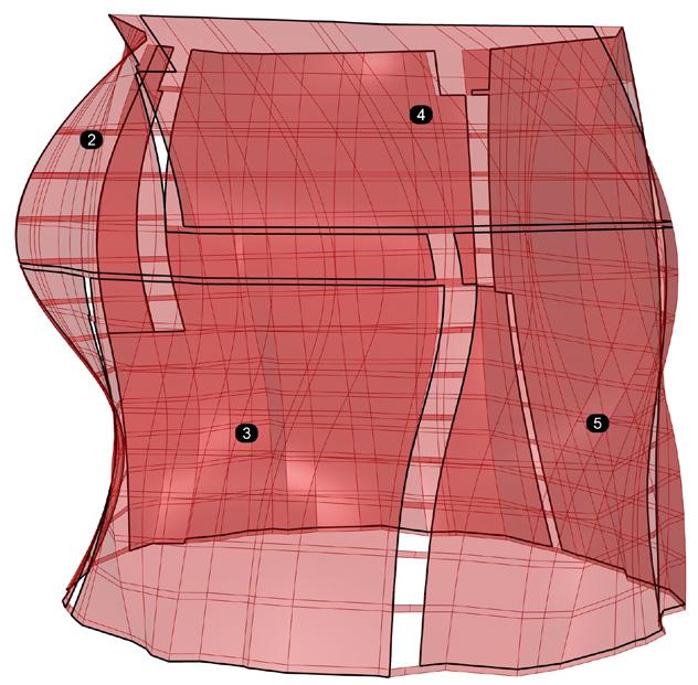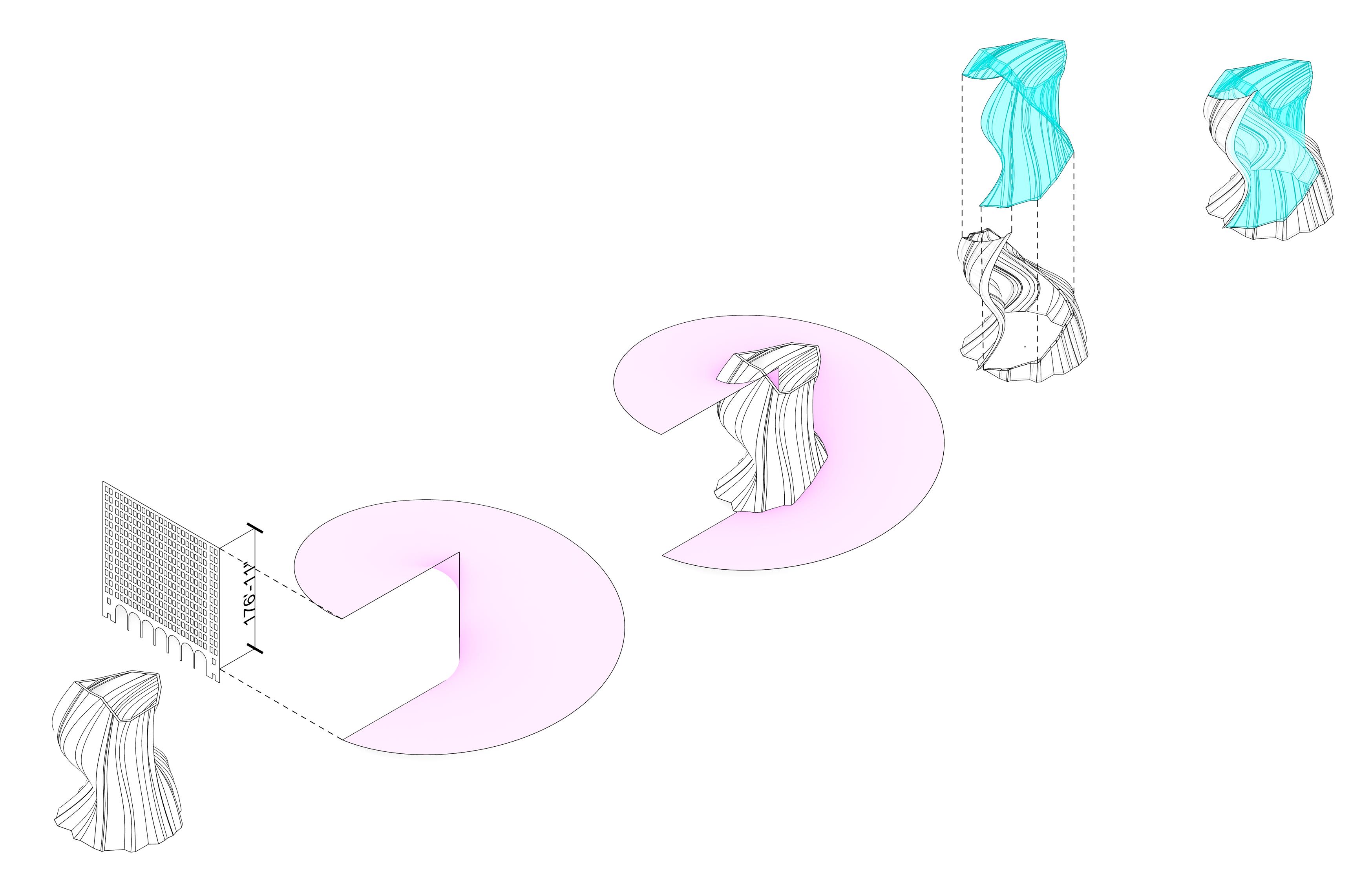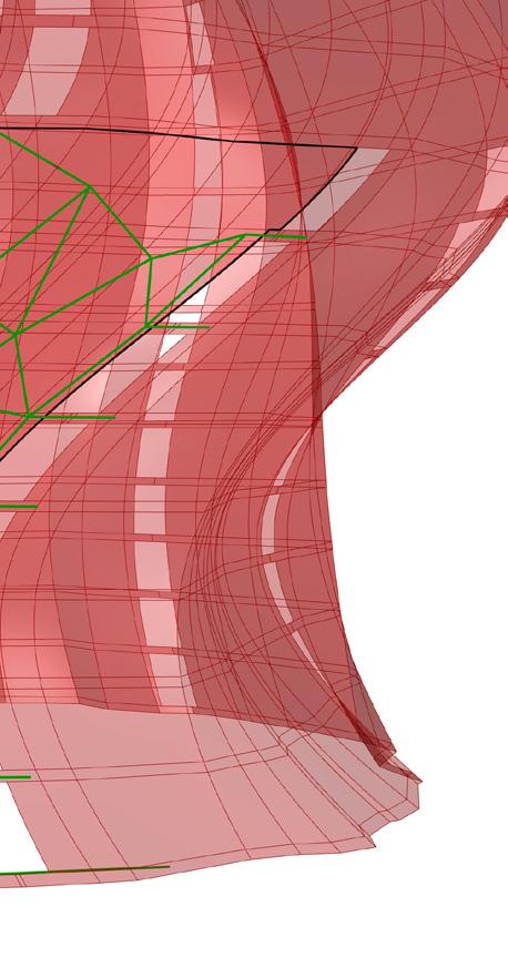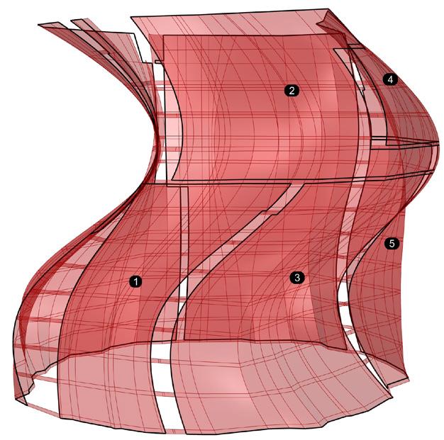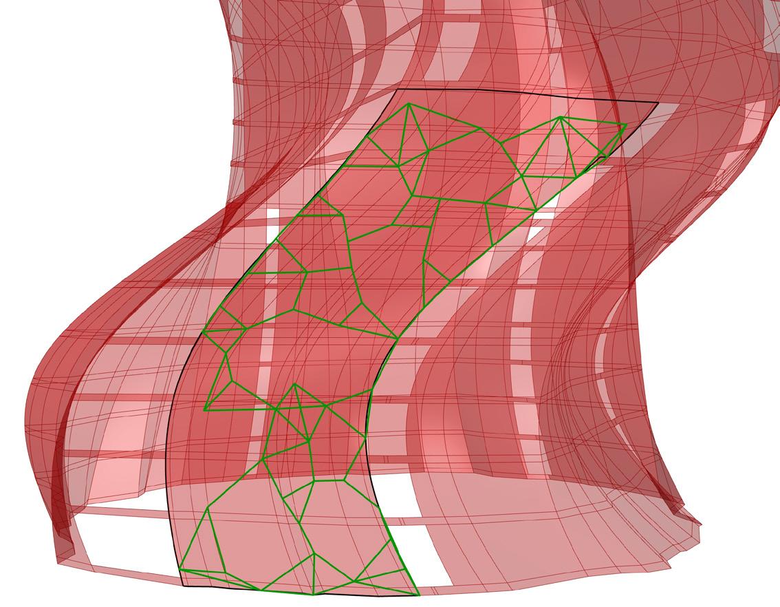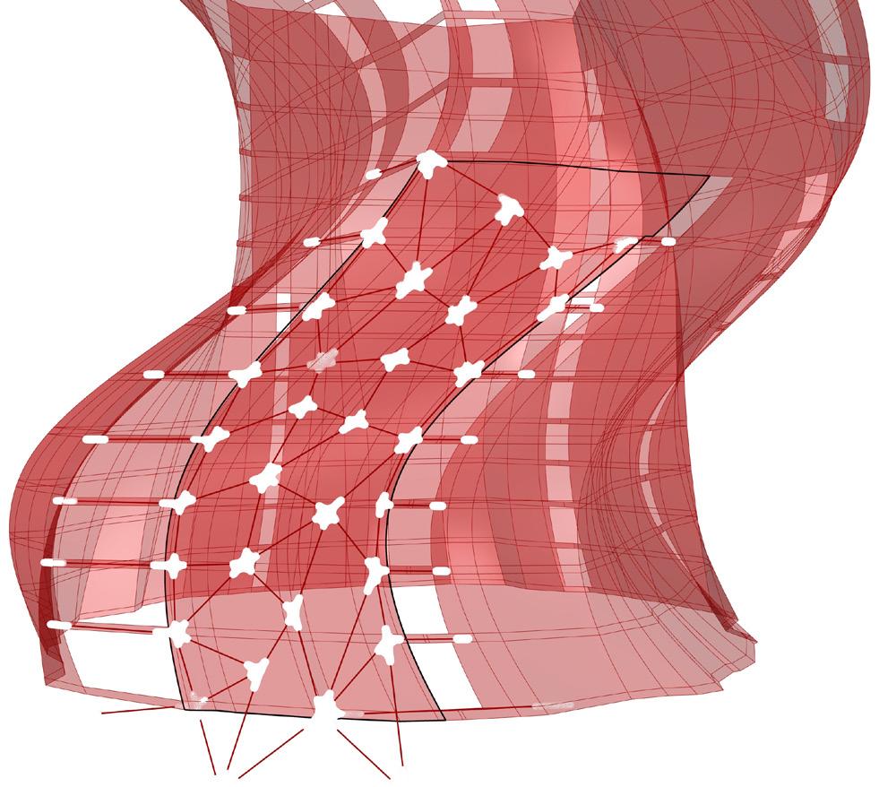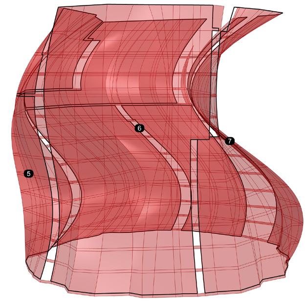 The terminal is built in sections spaced 5 meters apart. At every 5 meters, a section of a column is generated, which then gets lofted to achieve a continuous shape. As seen in A and B, no two columns across sections are alike, but columns within sections need not be mirrored.