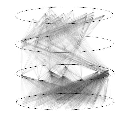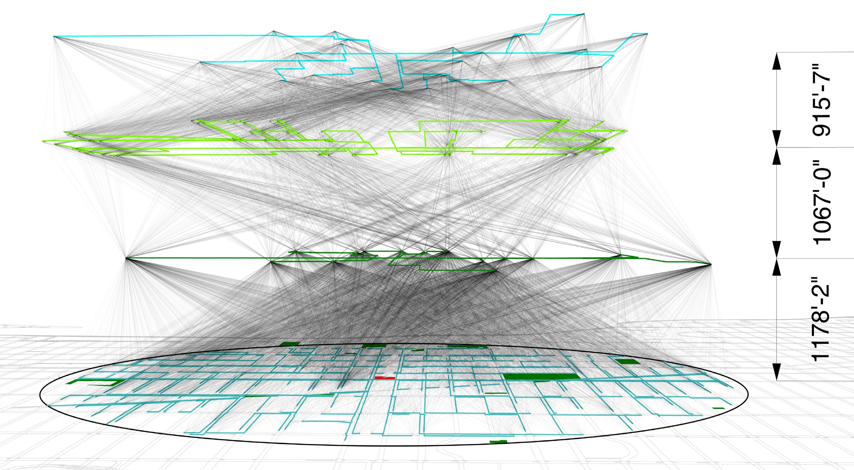 There are 25 million combinations one can construct by starting at a node on the first layer, and passing through a node on the following three layers. Each combination can be thought of as a story with a different narrative of the city.