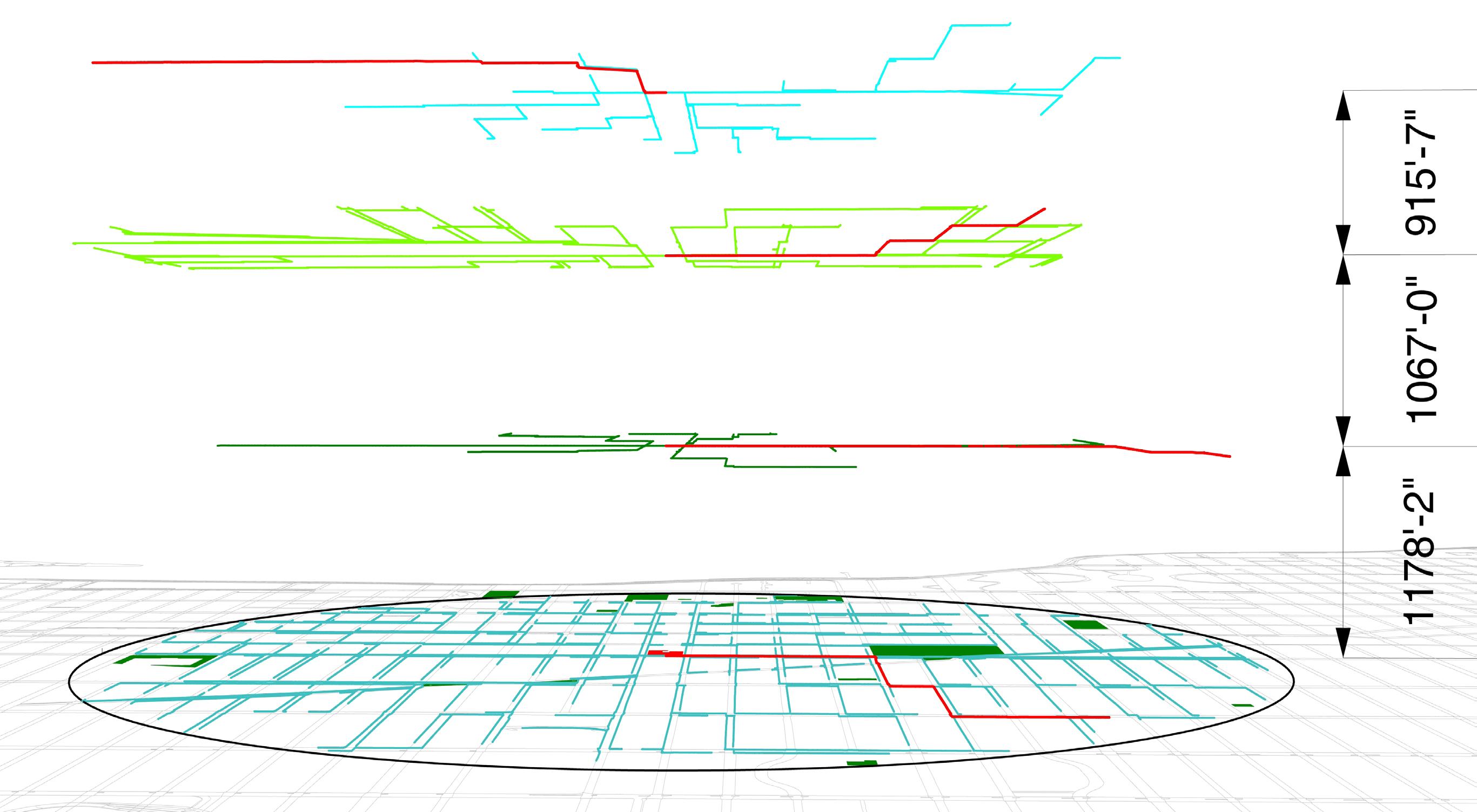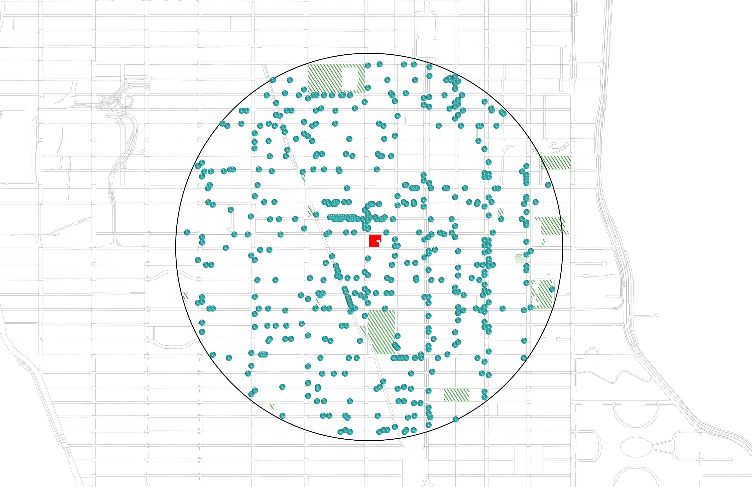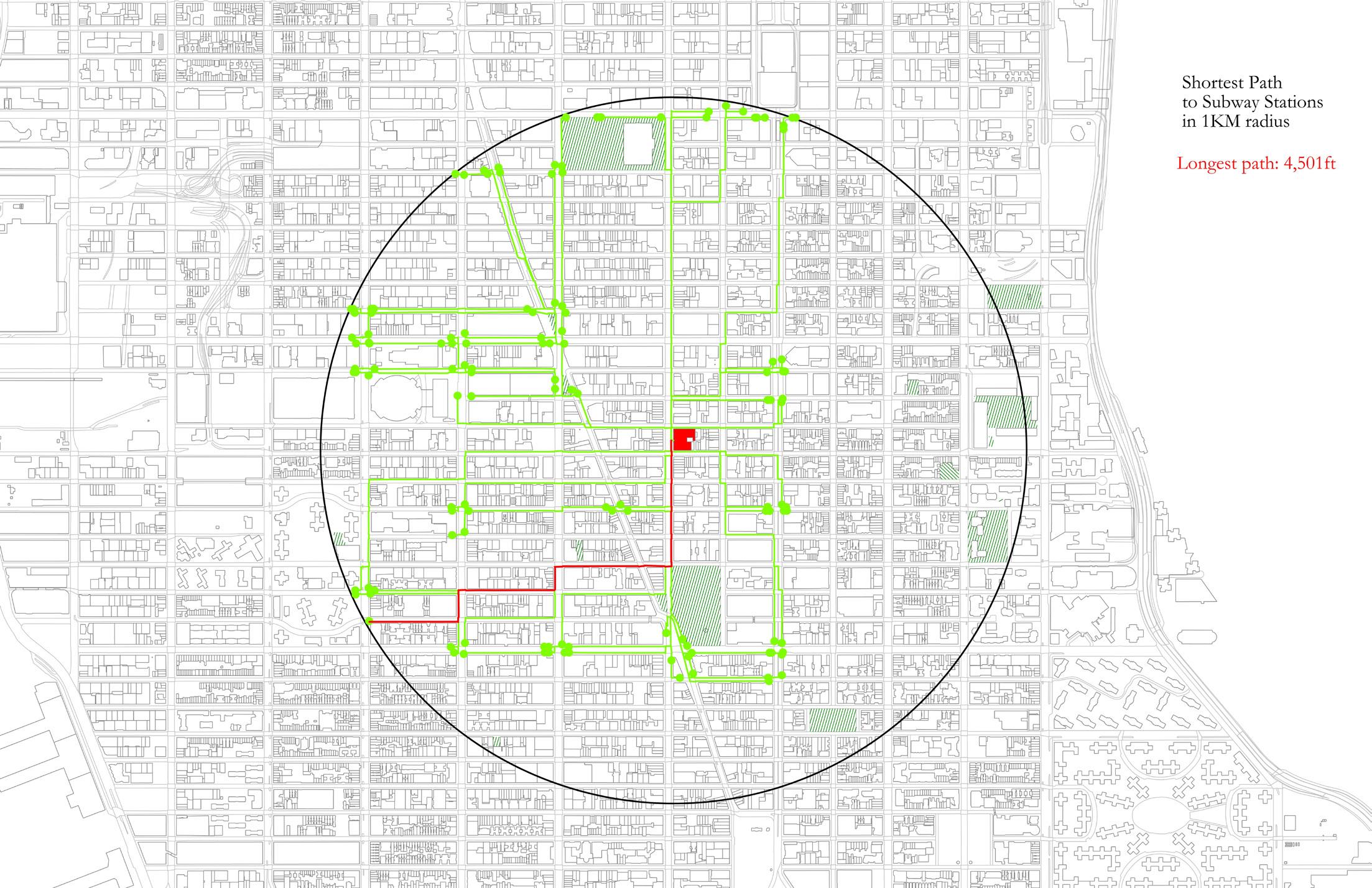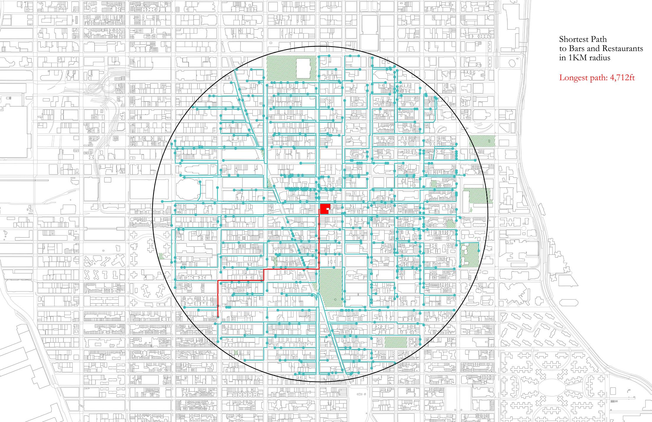Shortest path from each bar and restaurant to the site. The longest path, in red, is 4,712ft.