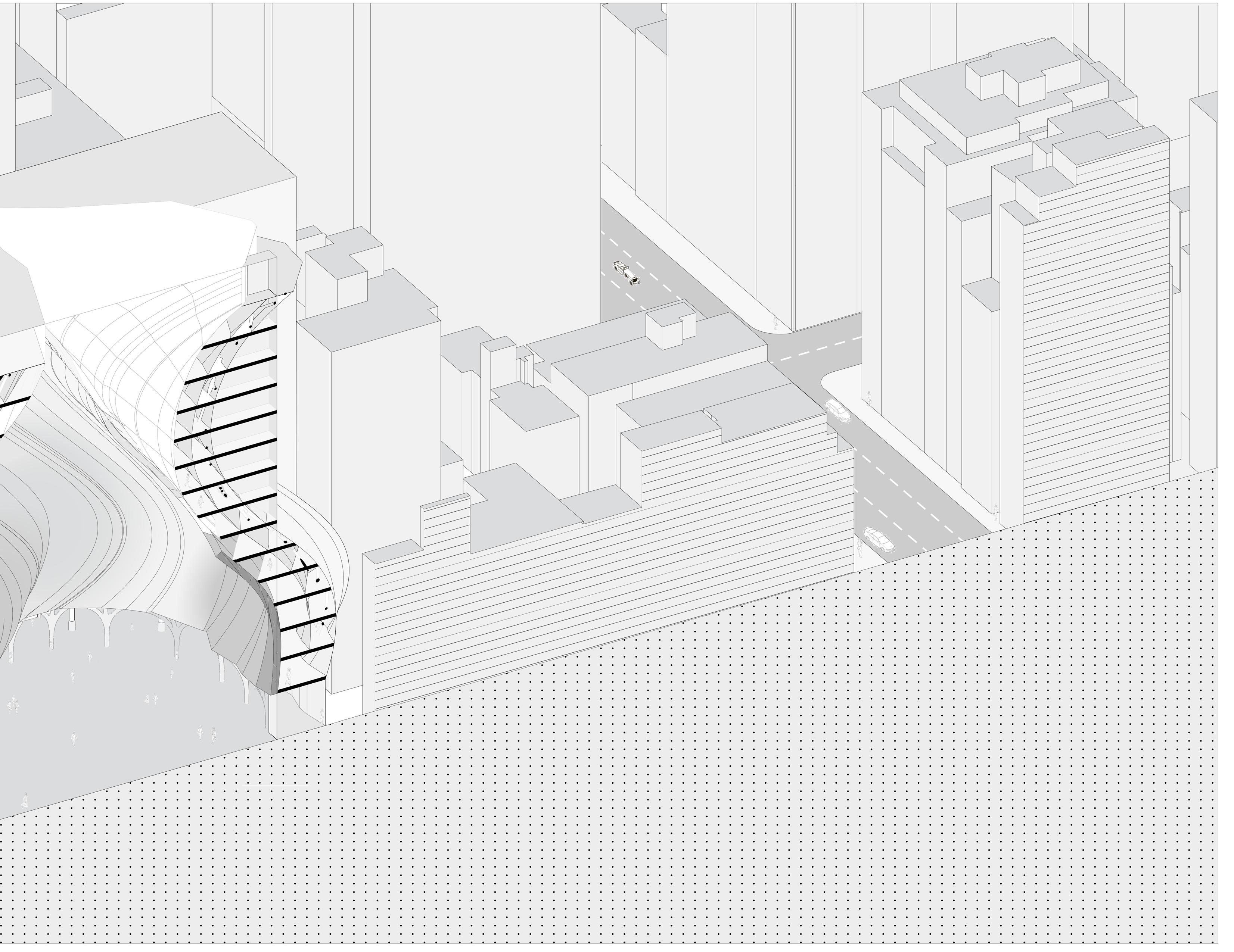 This investigation uncovers the architecture of the Yokohama Port Terminal designed by Foreign Office Architects. The architecture is about the marriage between structure and circulation. The physical model demonstrates two ramps embedded within one of the columns of the terminal.