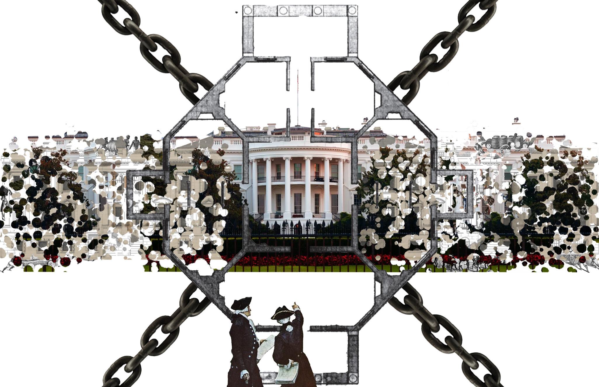 A collage superimposing one of Thomas Jefferson’s octagonal floor plans onto the elevation of the White House. The intent was to shine a light on the symbol of freedom being built by those who were not free. It suggests that the White House itself is still enslaved by its past.