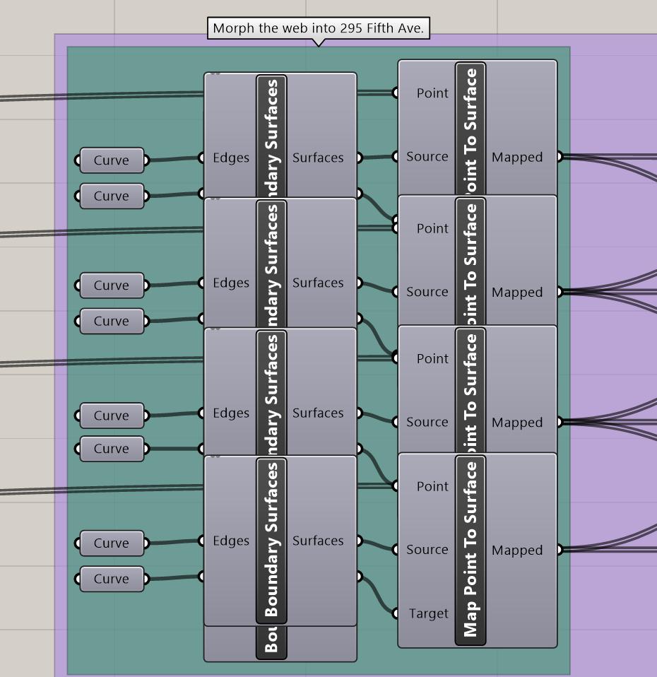 Step 1: Morph The Web into the building footprint of 295 Fifth Ave. by using the Map Point To Surface component from the Pufferfish plug-in.