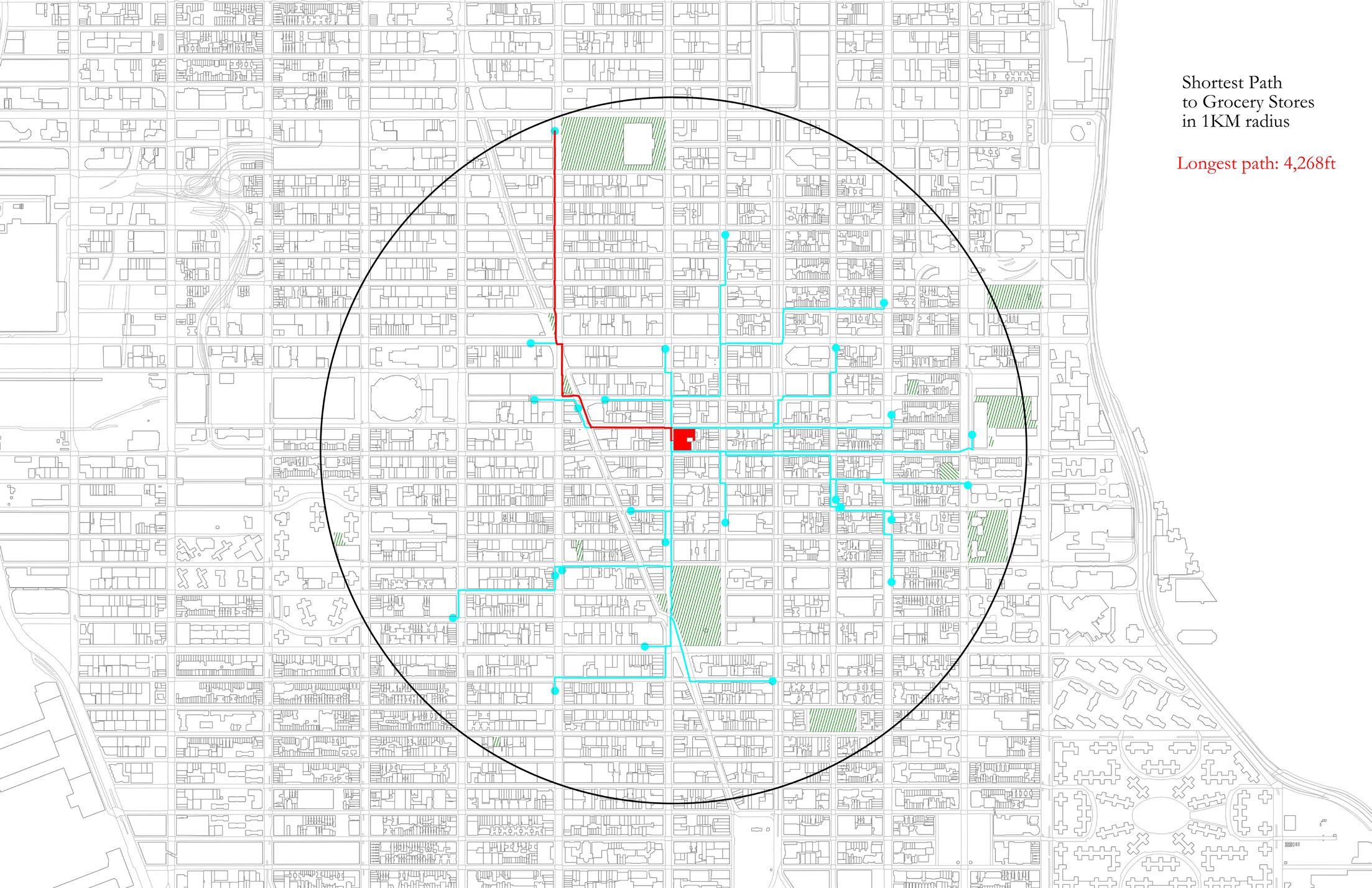 Shortest path to grocery stores. Length of longest path (in red): 4,268ft.
