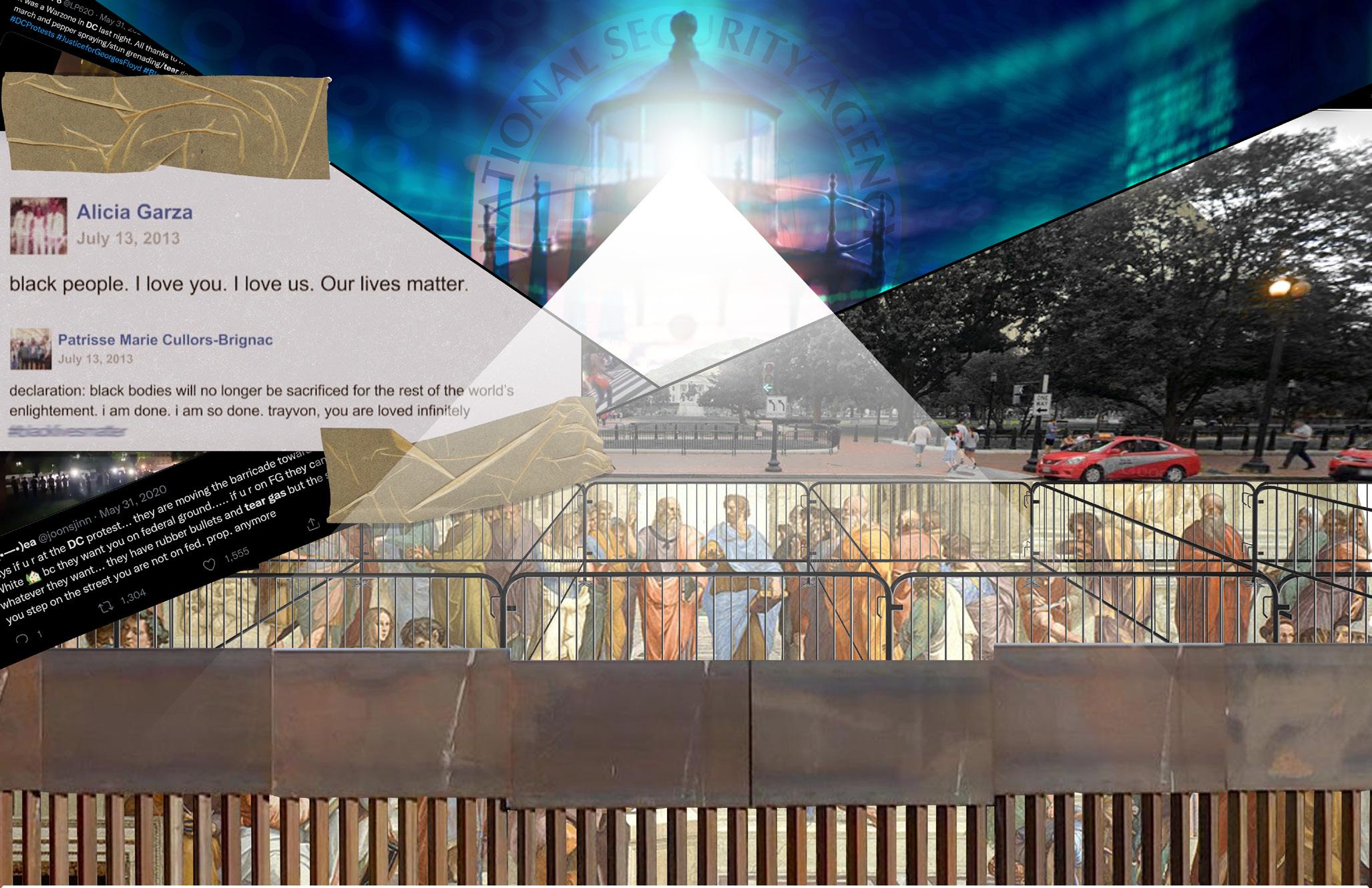 Of the three collages, surveillance and public spaces are two themes best suited for an intervention onto the White House.