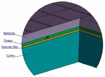 Analisando o funcionamento, a pressão interna máxima – Pi – do cunho de tardoz hidrostático na fase de prensagem deveria ser pró xima de Pe, no entanto, o cunho de tardoz tem áreas necessárias à fixação da membrana, pelo que estas suportam alguma força da prensagem. Se a distribuição do material cerâmico e carregamento, estiver perfeita, Pi é muito próxima de Pe. Claro que o sistema é pré-carregado com determinada quantidade de óleo, à qual correspon