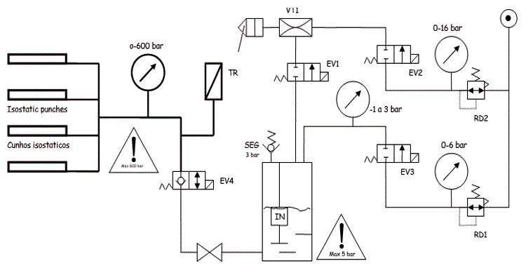 Está conectado à prensa e identifica o ponto máximo de Pi, compa rando o seu valor com um valor pré-estabelecido. A purga do sistema faz-se através de vácuo, retornando todo o óleo existente dentro do sistema para o depósito, assim como qualquer eventual gás.