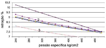 O gráfico seguinte representa a relação entre a retração da peça cerâ mica e a pressão específica, sendo a retração calculada entre a medi da do molde e a média das medidas finais da peça após cozedura, em peças quadradas e com diferenças de medidas menor que 0.4 mm.