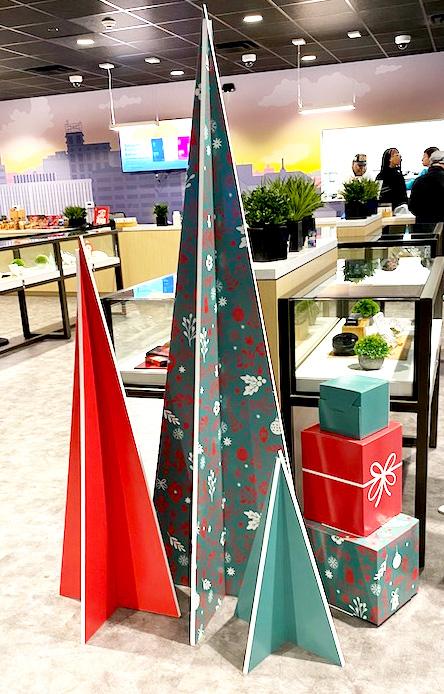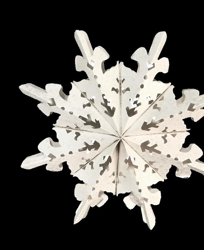 Santa’s Wonderland elements including icy trees, snow blankets, & 3D paper snowflakes