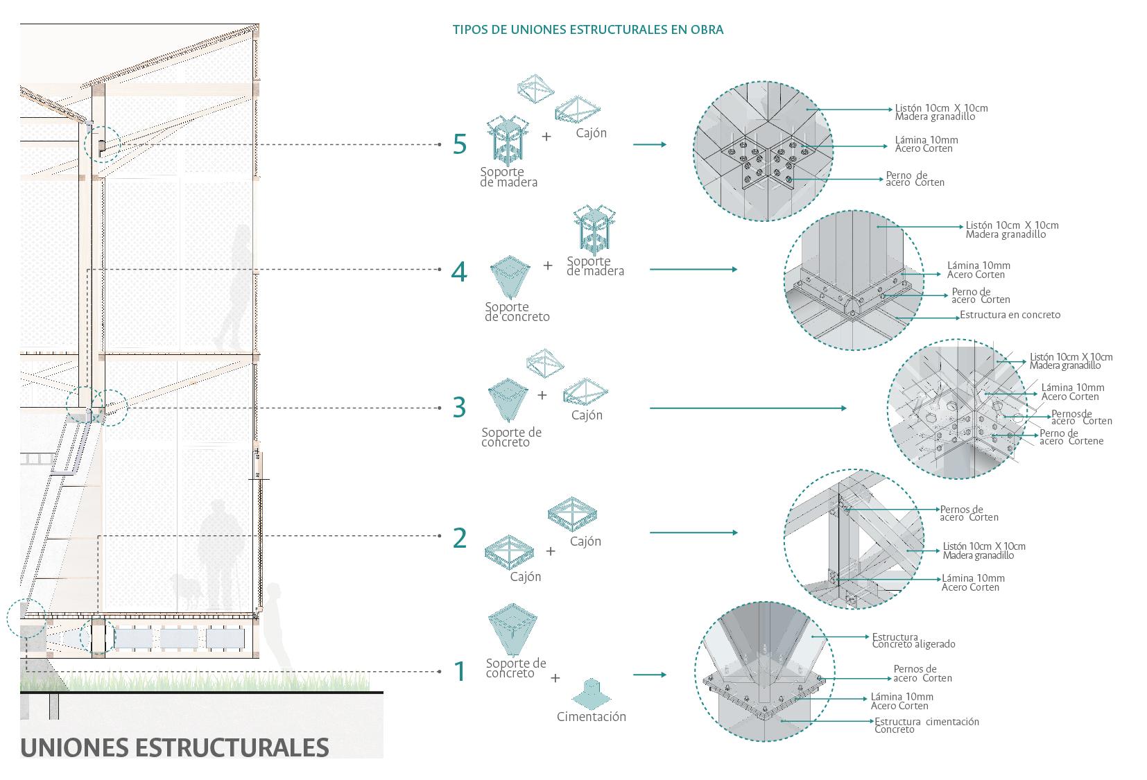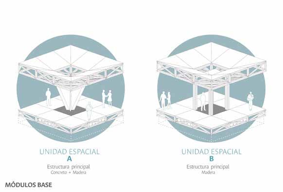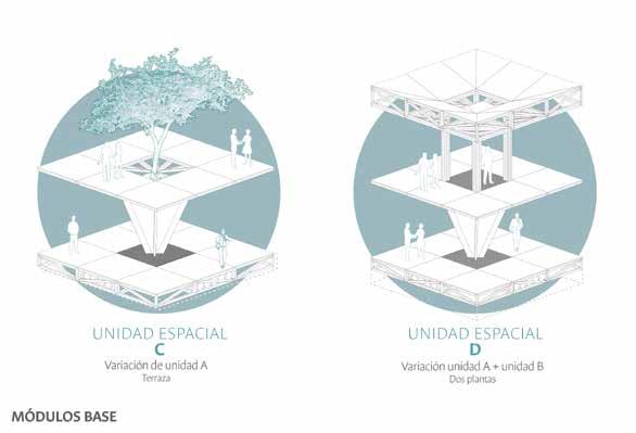 Para cumplir con estos requerimientos se siguieron parametros de diseño basados en las necesidades espaciales y tecnicas para cada vida, resultando dos unidades espaciales que serán la base del diseño y que están compuestas por elementos modulares de facil construcción, ensamblaje, desmonte y transporte. Cada unidad reune funciones tecnicas y a través de uniones estandarizadas, son compatibles entre ellas permitiendo realizar variaciones en planta y alzado. Siguiendo esta