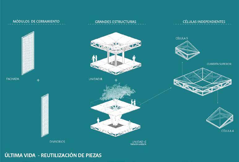 Una vez las piezas modulares del proyecto cumplan con su función, retornarán como recurso, no como desecho. Algunas partes se destinarán para usos técnicos como contención de terrenos, otras como páneles para la construcción de acuarios para la crianza de peces, las unidades tipo A podran reutilizarse, como estructuras de bajo impacto para la observación de aves.