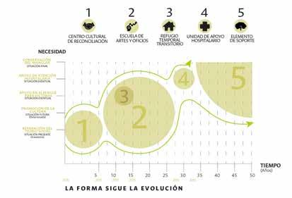 A partir de este análisis, los cinco programas se plantearon bajo una linea de tiempo hipotética y se ubicaron en diferentes puntos de la ciudad; Esto se hizo con el objetivo de evaluar la viabilidad de un edificio reutilizable, ya que se crean requerimientos tecnicos y espaciales complejos.