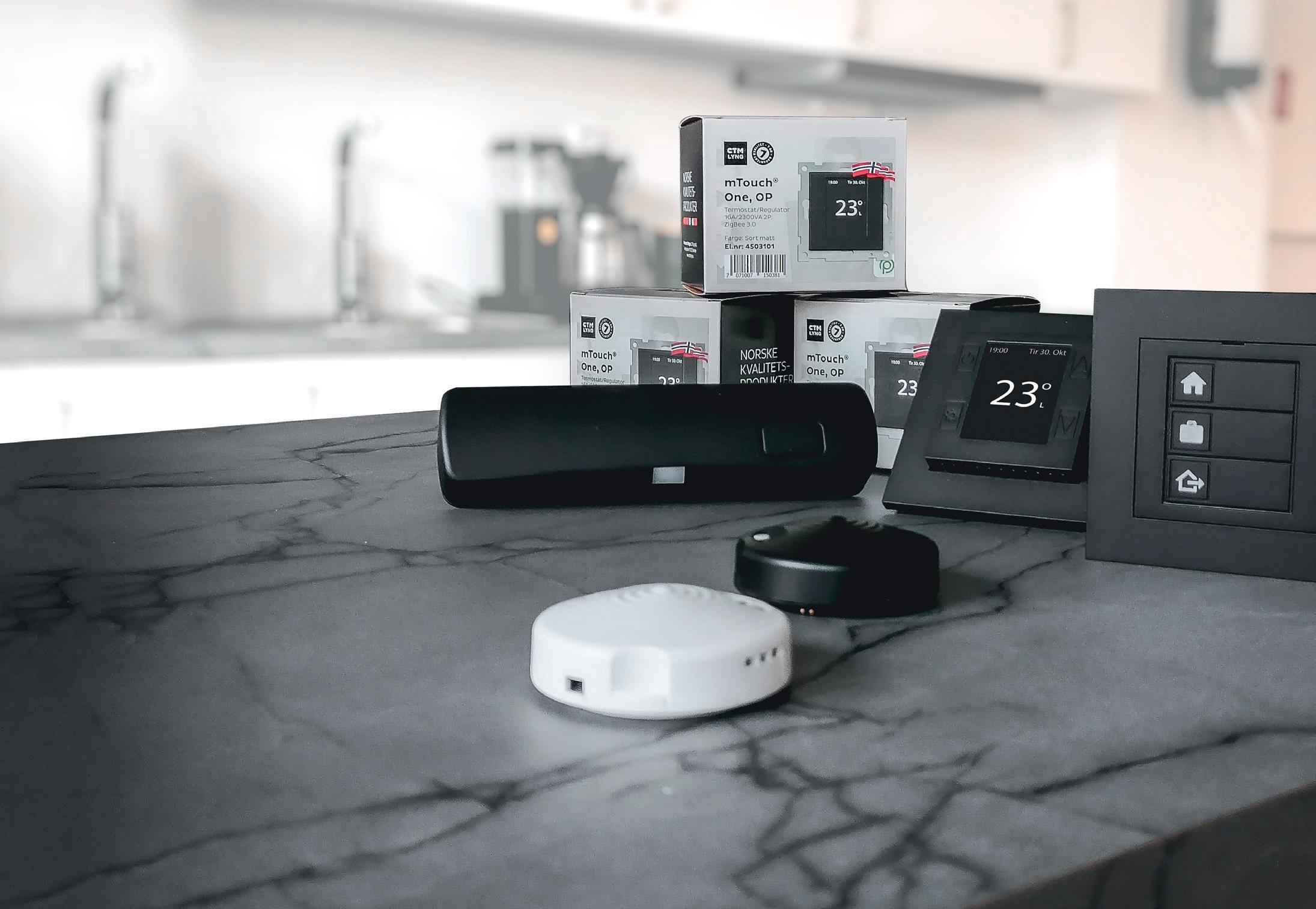 mTouch® One, OP Smart termostat med dagog nattsenking. Kan enkelt integreres i en smarthusløsning, med automatisk senking når strømmen er som dyrest. mTouch® EnergiKontroll HUB + Måleravleser med tilhørende app for smart strømstyring. Tjenesten Eva Smart Strømstyring er inkludert ved kjøp av produktet!
