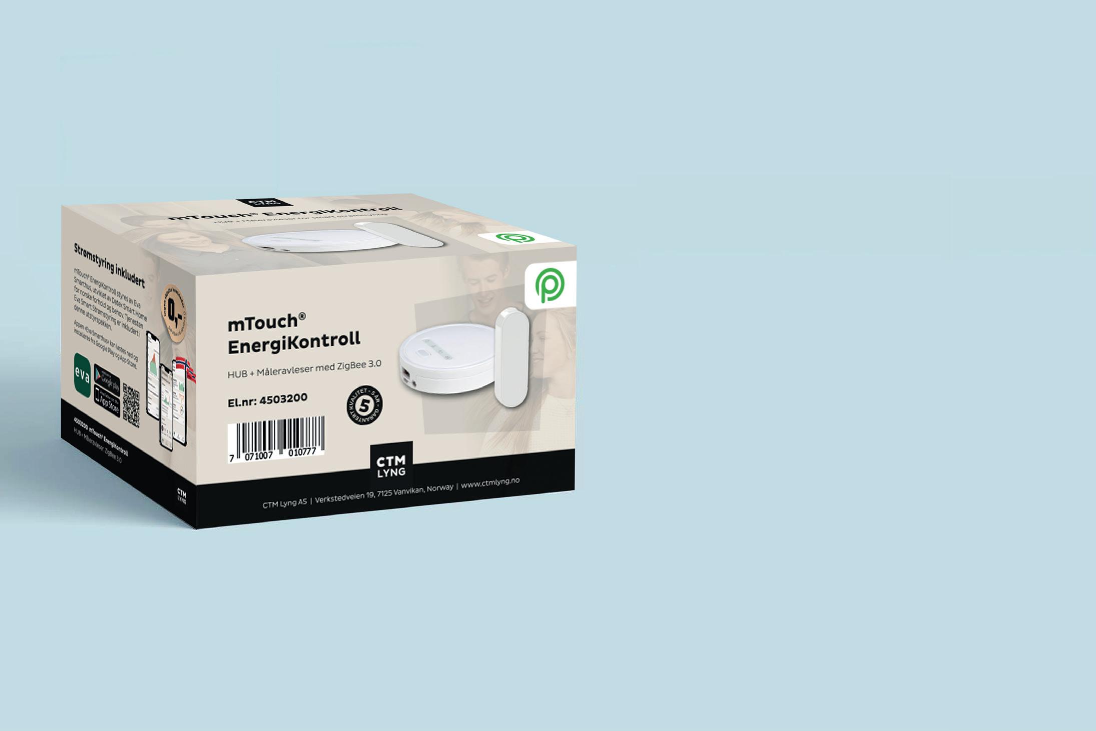 mTouch® One, OP Smart termostat med dagog nattsenking. Kan enkelt integreres i en smarthusløsning, med automatisk senking når strømmen er som dyrest. mTouch® EnergiKontroll HUB + Måleravleser med tilhørende app for smart strømstyring. Tjenesten Eva Smart Strømstyring er inkludert ved kjøp av produktet! Tavlerele 25, OP Tavlemontert relè for styring av laster som for eksempel varmtvannsbereder.