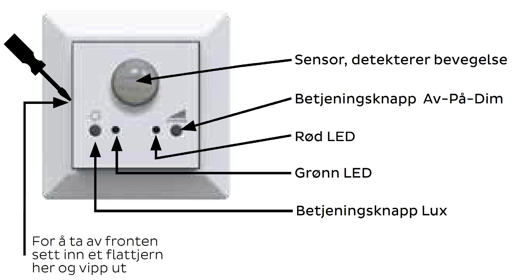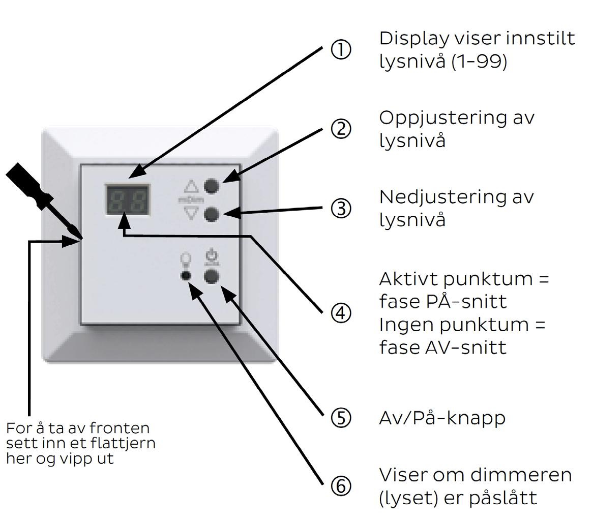 Dimmeren har knapp for AV/PÅ/DIM, gangtid fra 1 min til 2 timer og en rekke innstillinger for tenningsnivå, grunnbelysning etc.