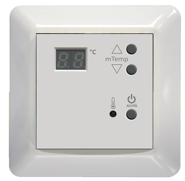 Rød lysdiode indikerer at oppvarming pågår. Gulvføler (MGF47k, Elnr 5450304) er inkludert.