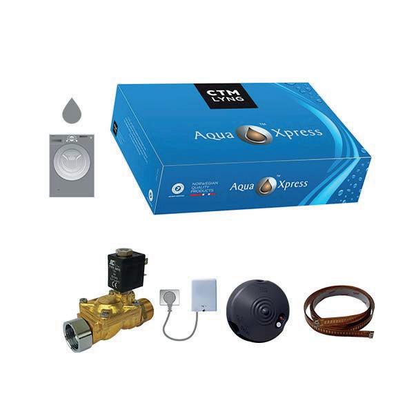 Komplett pakke for å stenge vanntilførsel til maskiner, ved deteksjon av fukt. Kan brukes til vaske-/oppvaskmaskin, kaffemaskin, kjøleskap med vanndispenser etc.