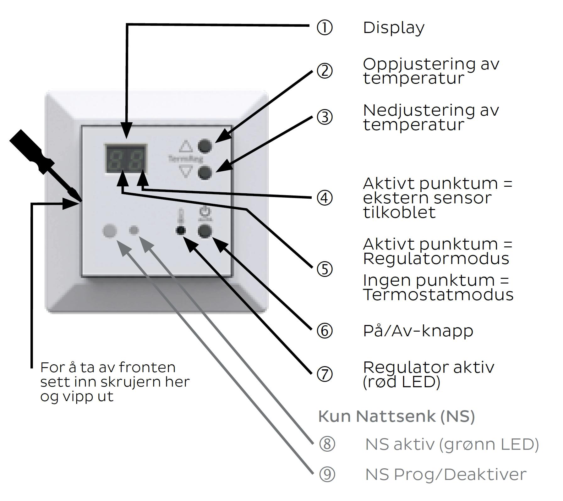 Rød lysdiode indikerer at oppvarming pågår. Gulvføler (MGF47k, Elnr 5450304) er inkludert.