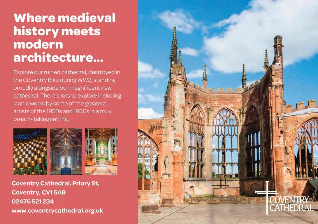 Cathedral campus. Explore the early medieval crasmanship, see the Ruins destroyed in the Coventry Blitz during WW2, now recognised as an international symbol of hope, and step inside the New Cathedral featuring works by some of the greatest artists of the 1950s and 60s. Experience a journey like no other.