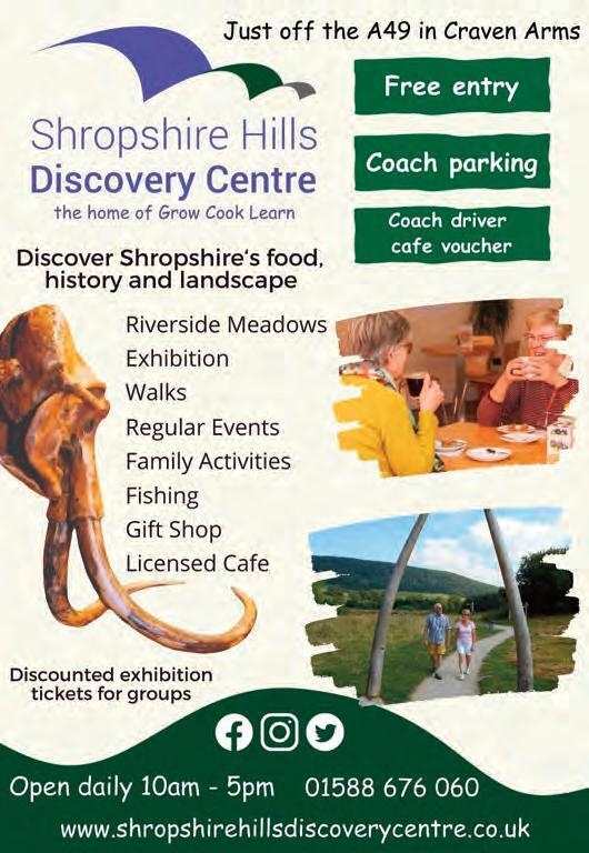 Whether it’s a day trip or just a break from travelling, you won’t want to miss a visit to this Shropshire gem. As well as group discounts for exhibition admission, the centre’s café offer a delicious range of hot drinks, snacks, homemade cakes and meals, all with a take away option. e riverside meadows surrounding the iconic building will also offer a welcome leg stretch with
